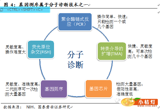 1.3. 引领分子诊断方法革新 更为快速、低廉的新一代测序技术的出现,极大地拓宽了基因测序的应用范围,尤其促进了分子诊断方法的革新。分子诊断作为体外诊断的手段之一,将分子生物学原理和技术应用于疾病实验诊断的新兴检验医学技术,其核心是基因诊断技术。常用的基因诊断技术包括聚合酶链式反应(PCR)、转录介导的扩增(TMA)、荧光原位杂交(FISH)、基因测序、以及基因芯片技术。