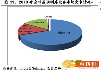 2.2. 上游设备与耗材——寡头技术垄断 目前市场上主流新一代测序平台主要由美国Illumina、Ion Torrent/Life Technologies (2014年被Thermo Fisher收购)、454 Life Sciences/Roche、 PacificBiosciences这四大生产商制造。 Illumina是一家致力于开发、生产和销售大规模基因组学分析集成系统的公司,它已经成长为基因测序行业的巨头,占据了全球设备市场三分之二的市场份额,其生产的下一代高通量测序仪HiSeq系列一直是市场上最为畅销的产品。另一方面,Life Technoloiges凭借小巧轻便的台式测序仪Ion PGM和Ion Proton也分割了20%以上的市场份额。而Roche曾收购454 成为第一个进入高通量测序市场的公司,近几年却因新产品匮乏导致市场份额不断收缩。