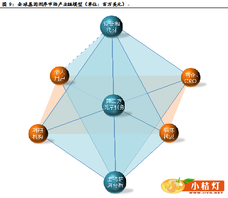 伴随着市场整体的飞速发展,产业内部历经了多次角力和整合,分工逐步明确,资源被优化布局,形成了以产业链为纵向,以终端用户为横向的立体化网络,相互关联、彼此渗透。纵向来看,设备和耗材供应商、第三方测序服务供应商以及新兴的生物信息分析服务商构成了产业链的上下游;横向来看,实现了面向科研机构、临床诊断、药企和CRO、个人用户这些不同终端用户的专业化分工。
