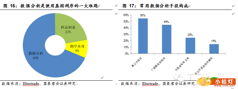 受益于测序服务的迅速增长,中国的基因测序产业成全球发展速度最快的地区之一,据Markets and markets预计,2012-2017年间CAGR达到20%~25%。 2.4. 生物信息分析——挑战与机遇并存 基因测序所生成的原始数据并不能反映任何有价值的信息,必须通过专业人员进行分析和解读,因此如何利用计算机科学和信息技术揭示大量而复杂的生物数据所赋有的规律对于整个基因测序行业尤为重要。然而,现今的生物信息分析涉及的数据存储、解读、及共享是整个基因测序行业目前面临的最大难题,主要原因一是来自于数据量的庞大,二是源于数据的复杂性。 Ebiotrade调查结果显示,普遍认为数据分析是使用基因测序的一大难题。目前仅有25%的受访者选择外包给专业的生物信息公司,大部分使用者选择用现有软件自行分析。但随着未来数据量越来越庞大,外包给专业化的生物信息公司将成为一种趋势。提供相关产品和服务的主要公司主要有 CLC bio (丹麦), Biomatters (新西兰), Partek (美国), Genomatix (德国), Knome (美国), DNASTAR (美国),诺和致源(中国)。目前这一市场份额基数较小,蕴含着巨大的市场潜力。