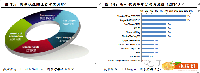 在测序仪国产化方面,华大基因(BGI)于2013年收购了美国Complete Genomics公司(简称CG),将其测序仪更名为BGISEQ,并向国家食品药品监督管理总局(CFDA)提出了申报。CG自成立之初就定位于一家专注于提供高通量的人类基因组测序服务的公司,该公司使用的测序平台采用DNA纳米阵列与组合探针锚定连接测序法,具有自主专利。其产品之前只应用于人类全基因组测序,与华大的测序业务结合之后,能切分到多大的市场份额仍未可知。 4月15日紫鑫药业公告,中国科学院北京基因组研究所就合作开发第二代高通量测序系统与吉林中科紫鑫科技有限公司签订产业转化意向书,共同开发基因测序仪项目。该平台建立在焦磷酸测序的技术机理上,类似于罗氏454 测序技术。据生物谷新一代测序论坛信息,此测序平台仍处于原型机阶段,即使投入量产后,仪器也还需试用以及优化改进,成熟的产品投放市场尚需漫长时日。 此外根据贝瑞和康网站信息,Illumina和贝瑞和康双方已经合作开发了一款适用于中国无创产前检测市场需求的测序仪,这款测序仪在中国的贝瑞和康自有医疗设备制造工厂生产,并且只在中国市场进行销售。 国产测序仪的前景如何目前还很难断言。Frost & Sullivan的调查结果显示,测序成本、数据质量、读取长度、通量大小、适用范围是选购新测序仪时最主要的考虑因素。尽管这两年新款的测序平台层出不穷,但在JPMorgan的受访实验室中,Illumina HiSeq2500/2000仍是优先考虑的产品,同时一代Sanger测序仪也有一定的市场。
