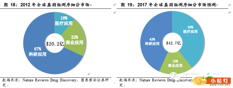 目前互联网巨头Google已涉足这一领域,例如Google和DNAnexus一起打造一个巨大的开放式DNA数据库,用来取代美国政府的国家生物技术信息中心(NCBI),后者因为政府预算吃紧即将关闭。双方将一起继续为科研人员免费提供DNA数据库信息(生物谷,2011年11月)。亚马逊数据云的公共信息平台上也有类似的数据库共享。另外,Google和比尔盖茨还投资了一家提供癌症全基因组测序及分析的公司Foundation Medicine(Foundation Medicine 招股书)。鉴于Google、苹果等公司对于医疗健康行业日渐增长的兴趣,一旦此领域显示出巨大的发展潜力,互联网公司凭借自身技术和资源的优势进驻该领域可能成为一种趋势。 3. 横向:医疗应用是未来主要增长点 尽管未来几年面向科研应用仍是最大细分市场,但是医疗应用为最快增长点。长远来看,药企和CRO也有很大的受益空间。