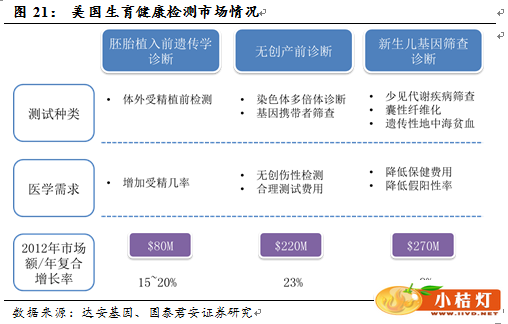 3.1.1. 生育健康领域应用相对成熟 新生儿出生缺陷不仅给家庭带来了沉重的复单,而且已经成为严重影响我国经济发展和人口素质的重要问题。一些特定的遗传性疾病往往在出生一定时间后才会表现出明显症状,因此初生儿早期的基因筛查能够帮助尽快在医学上进行早期干预,达到及早发现、及早治疗的效果。目前新一代测序技术在生育健康领域主要应用在以下方面。 3.1.1.1. 胚胎植入前遗传学诊断(PGD) 也就是第三代“试管婴儿”,主要用于检查胚胎是否携带具有遗传缺陷的基因。它是在试管婴儿技术基础上出现的,精子卵子在体外结合形成受精卵并发育成胚胎后,在其植入子宫前进行基因检测,以便使试管婴儿避免一些遗传疾病。通过DNA检测技术对胚胎的染色体异常或者遗传性疾病进行诊断,选择无异常的胚胎植入母体,从根本上提高“试管婴儿”的妊娠成功率,降低自然流产率,提高妊娠质量,并且可大大提高出生后婴儿的质量。