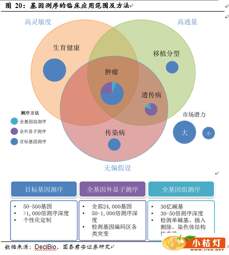 3.1. 临床应用领域逐步拓宽 以新一代测序技术为代表的基因检测具有高通量、高灵敏度、不需要了解遗传背景(无偏假设)的优点,主要在临床上应用于五个领域:生育健康、肿瘤个体化诊断和治疗、遗传病、传染病、移植分型(HLA)。