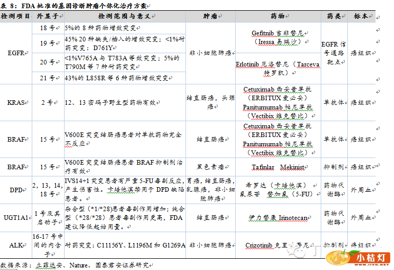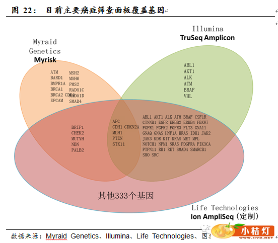 3.1.2. 肿瘤的个体化治疗 肿瘤的发生发展中,基因的改变在其中居于中心地位,致癌基因的异常表达和抑癌基因失活,是肿瘤细胞无限制生长的分子基础。肿瘤临床表现多种多样,且发病率逐年升高,迄今尚无简单的治疗方法或使用单一药物能治愈所有的肿瘤。询证医学、诊疗规范化和个体化已经成为肿瘤治疗的公认趋向。基因测序技术对于肿瘤个体化治疗主要有两方面应用:一是检测患者携带的肿瘤基因,二是检测肿瘤靶向药的靶点。 3.1.2.1. 肿瘤基因检测 利用目前的研究结果和DNA测序技术,可以对肿瘤患者高通量测序检测确认导致患者患病的基因或者受检者是否携带有肿瘤易感基因;寻找患者适用的肿瘤靶向治疗药物或者其他适宜的治疗手段。 自从美国最高法院判决任何人不能为具体的DNA片段申请专利,使得美国基因检测公司巨头Myriad Genetics已经注册的两个与乳腺癌和卵巢癌有关的基因(BRCA1和BRCA2)专利无效,使其今后的业务受到严重威胁,该公司随后推出了整合了25个肿瘤易感基因的癌症筛查面板(cancer panel)“Myrisk”,Life Technologies和Illumina也相继推出了基于新一代测序技术的癌症筛查面板,但这些产品目前尚未通过FDA认证。