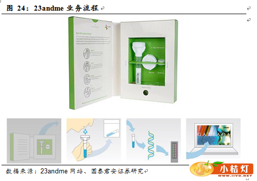当然,新一代测序技术在药物研发上的应用还属初级阶段,同样面临着数据存储、解读以及标准化的问题。但毫无疑问,新一代测序技术的出现对于药物研发具有里程碑的意义,现有的应用贯穿了早期研发到临床实验的各个阶段。可以预见,随着未来测序成本的降低,大数据分析能力增强,基因诊断和个体化治疗的不断发展,越来越多效率更高、副作用更小、更为特异的新药将会不断涌现。 3.3. 个人DNA信息咨询——疾病预警时代的开端 近几年兴起的直接面向用户(direct to consumer)的个人DNA信息咨询产业其实是基因检测市场化产物,基本模式是利用互联网和快递寄送,将检测试剂盒送至用户手中,再由其将采集的唾液及送回公司,并从中提取用户的DNA,检测结果也可直接从网上查询获取。 一部分公司像Easy-DNA、DNA Spectrum提供亲缘分析或亲子鉴定服务;另一部分公司像Genetic Testing Labs, Lumingenix, and deCODEme(被Amgen收购后服务已关闭)提供疾病风险评估,用户根据某些已知基因位点的检测结果(大多使用Multi-Gene PanelSequencing),在日后的生活中对饮食,生活方式以及相关的方面进行预防和干预。 提供这类服务的公司还包括23andMe (Google注资)、以及Geneplanet、Navigenetics (Lifetechnologies收购)、Pathway Genomics、Medomics、Genelex、Knome。目前这些公司绝大部分只能对已知的目标基因进行检测(仅Knome提供全基因组检测),靠大量的数据统计结果计算百分比,生物学意义和临床意义都不大,但随着基因与人类疾病健康关系的深入揭示,以及全基因组测序的普及,个人的遗传信息对临床个体化治疗将越来越具有指导意义。