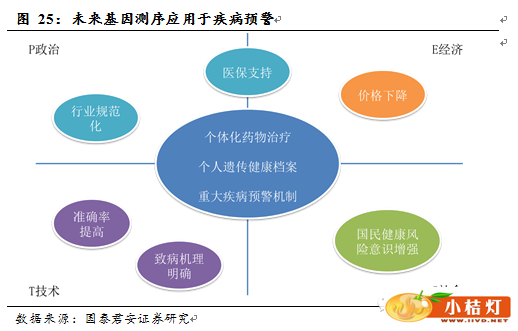 4. 行业总结及相关上市公司 新一代测序技术的飞跃式发展,检测成本的大幅下降,为其商业化应用奠定了技术基础。从产前无创筛查到肿瘤的个性化用药,二代测序技术临床应用范围正逐步拓宽,并快速革新传统的治疗与健康管理方式,孕育巨大的市场空间。 监管规范与基础生物信息学仍是目前制约新一代测序技术应用的主要瓶颈。监管与规范化问题有望随着试点审批以及相关注册法规完善逐步而解决,技术相对成熟的生育健康领域将最先恢复发展,重回快速增长的轨道。 生物信息学的发展,关于人类健康与基因关系的研究过程相对漫长,有赖于大数据等新技术的应用的支持,但对每一个病种或者每一个基因研究的突破都将打开一片新的市场空间。当大量生物信息大数据被解读,基因测序市场将与疾病预防相结合,开启新的技术时代。 巨大的市场前景吸引着大量资本与技术的进入,二代测序企业如雨后春笋般涌现。暂停基因检测之前,产前无创筛查主要被华大基因和贝瑞和康所瓜分,2014年3月CFDA开放申请后,申报企业的数量众多,我们认为市场存在再分配的机会。市场准入许可、成本控制和渠道管理将成为市场角力的关键,新进入企业能否克服后发劣势有望观察。 A股医药上市公司中涉及基因测序研发和业务的公司包括: 达安基因——参股17.14%的爱健生物与美国Life Technologies公司合作,已能独立开展基于二代测序的无创产前基因检测、单基因病检测、乳腺癌基因检测、肿瘤个体化用药基因检测、个人全基因组检测等服务,并与部分医院保持紧密合作,拥有一定技术和渠道先发优势,但综合配套管理能否跟进需要进一步观察。考虑公司是与技术相对成熟的外企合作,且达安自身的诊断业务已有医院渠道和自有独立医学实验室,未来或有业务协同的效应,有望在快速增长的测序市场中获得一定的份额。 千山药机——控股52.57%的宏灏基因已拥有基因芯片批文,但二代测序业务尚未开展,与湘雅等试点医院合作仍未确定。 紫鑫药业——与中国科学院合作开发的二代测序仪,仍在样机试验阶段,其技术水平能否满足实际应用存在较大的不确定,与其合作的医院尚未确定,二代测序业务尚未开展。 5. 风险提示: 基因检测试点批准进度慢于预期; 基因型与疾病关系等基础理论发展落后,制约基因测序应用范围的拓宽; 基因检测的不规范使用代理私隐及伦理问题风险。 来源:国泰君安证券 |