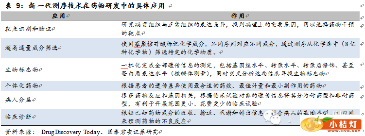 然而,基于新一代测序技术的肿瘤个体化医疗要实现临床常规化目前还面临诸多困难: 1)由于新一代测序技术步骤复杂,对操作者的要求高,目前对于二代测序的标准化和质量控制尚未定义,经常需要一代测序和PCR后处理验证,这也是FDA一直未批准基于新一代测序的基因检测相关产品的重要原因之一;2)癌症致病机理也不甚明确,大部分是基因和环境的共同作用结果,目前已知的与癌症高度相关的可靠生物标记(Biomarker)和驱动基因数量有限,无法作为常规检测大面积适用;3)临床操作面临难度,肿瘤基因经常会产生抗药突变,此时肿瘤病人尤其是肺癌病人已无法满足癌组织取样活检的用量和频率,动态检测患者的病情困难重重;4)缺乏规范的临床使用指导方案,目前的临床肿瘤医生一定要遵循标准治疗方案,标准方案失败时才开始尝试。 近几年新发现的癌症驱动基因和相关靶向药不断涌现,推动了癌症个体化治疗时代的到来。血液中循环肿瘤细胞(CTC)的发现使未来基于CTC单细胞测序技术的新型肿瘤诊断监测技术有望成为继无创产检之后的另一个重量级应用。 3.2. 制药企业和CRO企业受益基因测序发展 新一代测序技术早期主要应用在肿瘤和传染病治疗领域,现在越来越多的使用在新兴生物药的开发和疫苗生产上。目前药物研发部门使用的各种高通量技术,例如基因芯片、代谢组学建模、酵母双杂、蛋白质组学、高通量化学筛选、电子杂交定位,有望被新一代测序技术替代或作为补充。 肿瘤的应用 新一代测序技术能够在基因组水平、转录组水平、表观遗传水平更好地研究肿瘤细胞的特征。它既能区分染色体的结构异常,也能识别单碱基变异。由于敏感度高,NGS是研究肿瘤的理想方法。部分肿瘤类型,例如乳腺癌和大肠癌肿瘤细胞的完整基因组序列以及相应的生物标志物已经被报道。通过对肿瘤特异的突变识别和编目,可以找到潜在的新药物靶点,为肿瘤的靶向治疗的提供基础。 传染病的应用 随着微生物基因组信息逐渐增多,新一代测序技术在抗细菌和抗病毒药物研发领域得到广泛应用,尤其在追踪其耐药突变方面。然而,目前这些研究多出自于学术机构,很少来自于制药公司。细菌和病毒经常会对现有药物产生耐药性,因此通过下一代测序技术理解微生物的耐药突变对未来抗传染病药物开发尤为重要。 疫苗开发的应用 在疫苗的质量控制中使用新一代测序技术可以更早地检测到生产流程中的外源病毒污染。另外,在今后的疫苗开发中,NGS有助于理解对于特定疫苗不同使用者产生的不同副反应和免疫反应。未来,新一代测序技术将用于监测疫苗使用的整个过程,评估其安全性、效率以及在不同宿主中的反应差异。 生物制药 新一代测序逐渐开始在生物制药领域的应用,尤其是在抗体库的构建领域。联合使用新一代测序和荧光定量PCR技术的方法相比传统的噬菌体抗体库技术速度更快、成本更低,而且对抗体库多样化的后续分析更为精确。另外,通过新一代测序和噬菌体cDNA文库技术的联合使用,可以识别某个多功能酶的新互作蛋白,或者已知互作蛋白的新结合域。相比传统方法如酶联免疫吸附试验以及一代测序速度更快,信息量更大。