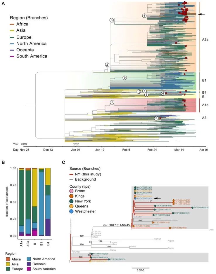 | 随着新冠肺炎(COVID-19)的进一步蔓延,全球超过650万人感染了新型冠状病毒(SARS-CoV-2),其中美国疫情最为严重,确诊病例数超过190万例,而作为美国疫情震中的纽约州,确诊病例数也已超过37万例。4月初,《纽约时报》在一篇报道中提到,美国两所高校正在进行的研究表明纽约州的新冠疫情主要起源于欧洲。如今,其中一所高校的研究报告已经出炉,为揭示SARS-CoV-2早期的全球传播动态提供了进一步支持。西奈山伊坎医学院的一支研究团队在对西奈山医院早期收治的84名COVID-19患者进行病毒测序后发现,这些病毒毒株主要是从欧洲和美国其他地方引入,并且早在3月初病毒已经进入了社区传播阶段。相关报告近日发表在《Science》上。  DOI:10.1126 /science.abc19172月29日,纽约州发现了首例COVID-19病例。截至3月18日,共有84名COVID-19患者前往西奈山医院就诊,其中44人为女性患者,40人为男性患者,他们来自纽约市四个大区和纽约州的三个县。研究人员从这些患者的鼻咽拭子中获取了90个病毒分离株并对其进行了测序,得到了72个完整的和18个部分的基因组。为了追溯纽约州疫情的早期发展,研究人员从全球流感数据共享平台(GISAID)下载了截至4月1日世界各地上传的2,363个SARS-CoV-2病毒序列,将其连同从84名患者身上获取的病毒序列进行了系统发育分析。系统发育树显示,纽约的84个病毒分离株可分为A1a、A2a、B、B1、B4这5个亚型,其中64个病毒分离株聚集在A2a类,该类主要由来自欧洲COVID-19患者的分离株组成,说明纽约州早期的COVID-19病例大多为欧洲引入。 纽约州和全球其他地区SARS-CoV-2分离株的系统发生关系随后,研究人员分析了与纽约市相关的病毒传播事件的时间,发现A2a进化树底部的最早序列包括自2月下旬开始来自意大利、芬兰、西班牙、法国、英国和其他欧洲国家的病毒分离株,以及从3月第一周开始的一些北美分离株。在这个分类中存在着两个突变,将纽约和其他地区的分离株区分开来,这说明可能在2月初到2月中旬当地至少引入了两个独立的病毒株。总之,这项研究表明,纽约州当地的新冠疫情主要来自美国和欧洲之间的无追踪传播,仅有有限证据显示该病原是从中国直接引入的,不仅为全球范围内SARS-CoV-2的多样性提供了快照,也为地方一级流行病动态提供了参考。[1] Introductions and early spread of SARS-CoV-2 in the New York City area. [2] Study shows NYC COVID-19 outbreak had European and U.S. origins. |