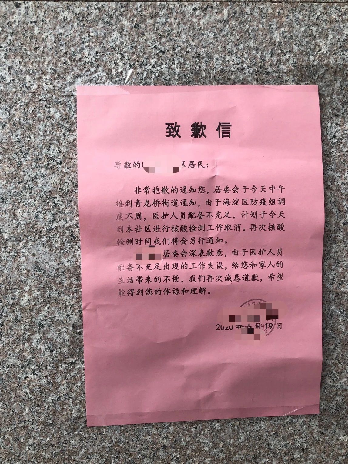 6月19日,海淀区青龙桥街道某社区居委会门前张贴了一张致歉信。其中提到,由于医护人员配备不足,原定的居民核酸检测时间择期通知。此前该街道曾出现了一例确诊病例。
