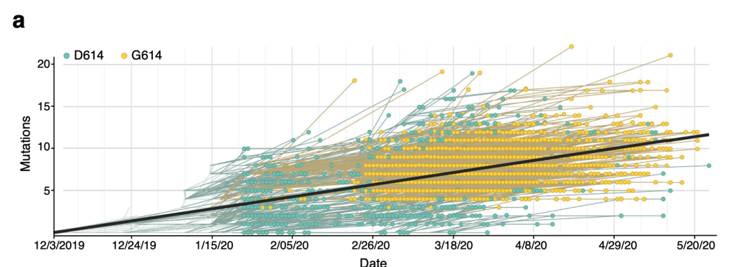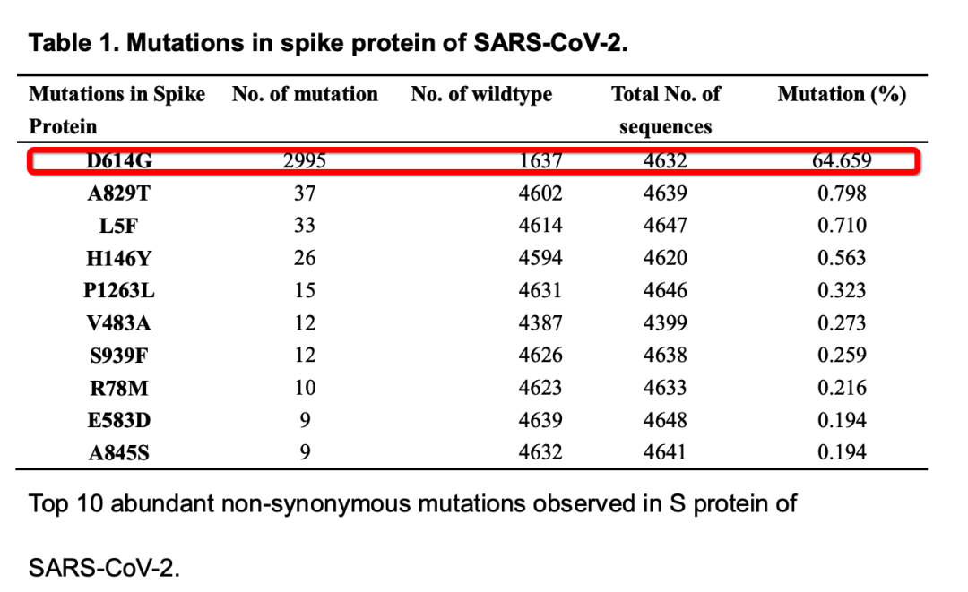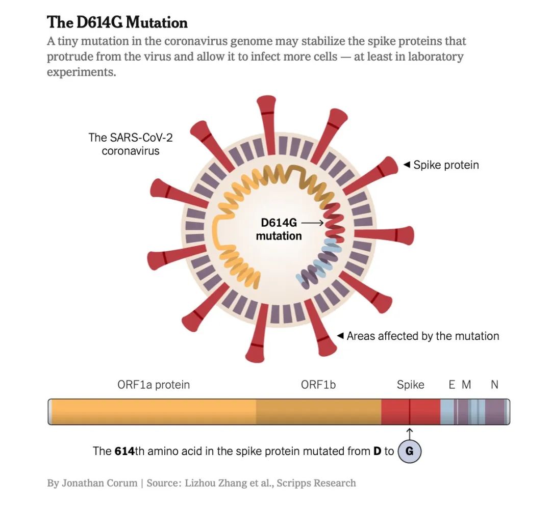 文章指出,迫切需要确定这种称为D614G的突变会对从未有相关突变病毒中恢复的人们造成何种威胁。同样令人担忧的是,对于以前感染了较温和毒株且已经康复的患者,新毒株实际可能导至第二次感染,但尚无临床证据。他们的研究发现来自恢复期COVID-19患者的93%(38/41)血清可以中和S-D614和S-G614伪型病毒具有相当的效率,但约7%(3/41)的恢复期血清显示出对S-G614假病毒的中和活性降低。这些发现对SARS-CoV-2传播和免疫干预具有重要意义。黄爱龙教授团队指出,鉴于SARS-CoV-2 RNA基因组的进化性质,可能需要进一步考虑抗体治疗和疫苗设计,以适应D614G和其他可能影响病毒免疫原性的突变。Spike mutation pipeline reveals the emergence of a more transmissible form of SARS-CoV-2,bioRxiv preprint doi: https://doi.org/10.1101/2020.04.29.069054今年4月份,IBM AI医疗团队在四月份的一项研究中警告称,D614G突变可能会降低针对该病毒刺突蛋白的疫苗计划有效性。5月,洛斯阿拉莫斯(Los Alamos)国家实验室的研究员贝特·科伯(Bette Korber)发表论文指出,欧洲和美国东海岸流行的是一种新型突变体病毒,其传播力更强。科学家开始将注意力集中在D614G突变上。另外塞尔维亚一项研究中得出类似的结论。但综合多项研究来看,新冠病毒基因序列23403位点从A(腺嘌呤)突变成了G(鸟嘌呤)导至的D614G突变,相应的棘状蛋白的第614个氨基酸从D变成了G D614G突变使病毒的棘状蛋白增加4-5倍,并使这些蛋白更稳定、进而使病毒更容易侵入人体细胞,实验室环境下可达9倍效率,D614G突变在现实环境下对新冠病毒感染力的影响仍待研究。北京疫情病毒突变属于D614G变异,并已有多地报告北京相关病例,诸如天津市疾控中心对天津第137例确诊病例呼吸道标本的新冠病毒全基因组高通量测序和序列分析,并由中国疾控中心复核,确认与北京新发地市场相关病例的病毒序列完全相同,属于L基因型欧洲家系分支I。这可能给防疫带来困难。目前,北京市正加快储备和加强北京核酸检测的力量,以进一步扩大核酸检测范围,湖北、辽宁等多地也开始援助北京,以提升其检测能力,并有强化社区管控趋势。