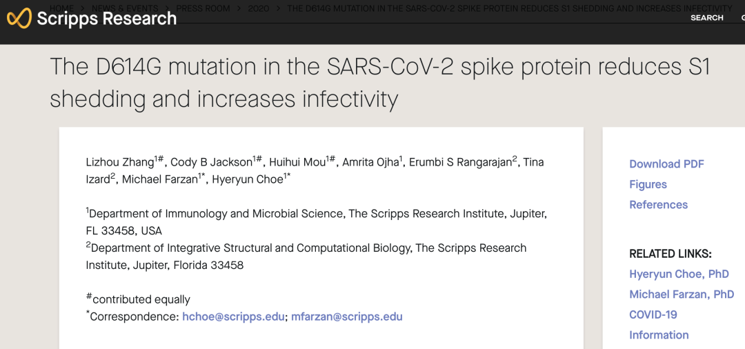 这种较大的感染力与S1脱落较少和S蛋白更多地融入伪病毒体有关。使用SARS-CoV-2 M、N、E和S蛋白产生的病毒样颗粒也得到了类似的结果。然而,SG614与ACE2的结合效率并不比SD614高,含有这些S蛋白的伪病毒被康复期血浆中和的效率相当。这些结果表明SG614比SD614更稳定,与流行病学数据一致,表明带有SG614的病毒传播效率更高。 D614G突变,bioRxiv preprint doi: https://doi.org/10.1101/2020.06.12.148726需要指出的是,该研究是使用制造关键冠状病毒蛋白的无害病毒进行的,研究观察到的变化是否还能转化为现实世界中传播能力的提高,还需要进行更多的流行病学研究。The D614G mutation in SARS-CoV-2 Spike increases transduction of multiple human cell types,bioRxiv preprint doi: https://doi.org/10.1101/2020.06.14.1513576月15日,纽约基因组研究中心Neville E. Sanjana团队基于伪病毒和人肺上皮细胞等细胞系,再次发现D614G变异让伪病毒感染细胞的能力提升2.4-7.7倍,其中感染人肝细胞(Huh7.5-ACE2)最为显著。来自美国这些研究表明,这一新冠病毒变种与此前中国武汉发现的病毒不同(没有这种刺突蛋白突变),这或许可以解释为什么新冠病毒能够在欧洲、北美和拉丁美洲更广泛地传播。但也有其他科学家警告称,要确定病毒差异是否影响爆发过程的因素,还需要进行大量研究。其他因素显然也影响了这一传播,包括封城时间、出行、社交方式和运气等。D614G流行变异情况,The D614G mutation of SARS-CoV-2 spike protein enhances viral infectivity and decreases neutralization sensitivity to individual convalescent sera,doi: https://doi.org/10.1101/2020.06.20.1613236月20日,重庆医科大学黄爱龙教授团队在预印本网站Biorxiv发表研究称,新冠病毒刺突S蛋白D614G氨基酸残基的突变可显著增强病毒的感染能力,并且能够降低对个体恢复期血清的敏感性。这项研究再次证实美国斯克里普斯研究所等机构对出现在S蛋白中的D614G变异做了初步研究,发现新冠病毒S蛋白的D614G变异会提升新冠病毒感染细胞的能力。文章指出,介导SARS-CoV-2进入宿主细胞的刺突蛋白是疫苗和治疗剂的主要靶标之一。因此,深入了解S蛋白的序列变异是了解SARS-CoV-2的感染和抗原性的关键。黄爱龙教授团队观察到了S蛋白在614位的显性突变(天冬氨酸对甘氨酸,D614G突变)。使用基于伪病毒的分析,发现S-D614和S-G614蛋白假型病毒共享一个共同的受体,即人血管紧张素转换酶2(ACE2),该重组受体可以被重组ACE2与人IgG1融合的Fc区阻断。但是,S-D614和S-G614蛋白表现出功能差异。首先,S-G614蛋白可以更有效地被丝氨酸蛋白酶elastase-2裂解,其次,S-G614伪病毒感染的293T-ACE2细胞比S-D614伪病毒更有效。S-G614蛋白伪病毒显示出更强的感染力,The D614G mutation of SARS-CoV-2 spike protein enhances viral infectivity and decreases neutralization sensitivity to individual convalescent sera,doi: https://doi.org/10.1101/2020.06.20.161323