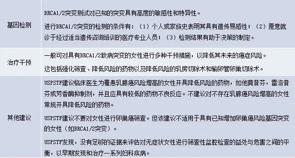 初级保健临床医生可以使用一些工具来决定患者是否需要转诊至遗传咨询,以进行更明确的风险评估。USPSTF 找到了足够的证据证明这些家族风险评估工具可以准确地识别出 BRCA1/2 突变可能性增加的女性,如 7-问题家族史筛查工具。 USPSTF 评估了的工具还包括安大略省家族史评估工具、曼彻斯特评分系统、转诊筛查工具、家谱评估工具、国际乳腺癌干预研究工具(也称 Tyrer-Cuzick)和 BRCAPRO 精简版。这些工具的灵敏度约为 77%~100%,受试者工作曲线下的面积为 0.68~0.96。显著没有足够的证据推荐何种工具更优。 遗传咨询的过程包括对潜在 BRCA1/2 致病突变的详细家系分析和风险评估。它还包括鉴定需要检测的对象,进行患者教育,讨论基因检测的利弊,对测试后结果的解释以及可选择管理方案的讨论。 进行 BRCA1/2 突变的基因检测是有条件的,首先被检测者应具有遗传易感性的个人或家族史,其次是其愿意接受遗传咨询,而最重要的是检测的结果应有助于临床决策的制定。 临床实践指南建议 BRCA1/2 突变的检测应从患有与 BRCA 相关癌症的亲属(包括男性)开始,从而在对没有患有癌症的个体进行检测前,先确定该家族中是否存在有临床意义的突变。如果无法获得患有 BRCA 相关癌症的亲属标本,则应对最有可能存在突变的亲属进行检测。 应根据家族史来决定需要分析的突变类型。对于存在已知突变的家族或存在某些突变更常见的祖先时(如德系犹太人突变),应对这些特定突变进行检测。 对具有 BRCA1/2 致病突变女性的管理主要是通过各种干预措施来降低其未来癌症的风险。主要的干预措施包括更早、更频繁或更密集的癌症筛查(如乳房 MRI 或 X 线摄影),使用降低风险的药物(如选择性雌激素受体调节剂或芳香酶抑制剂)以及降低风险的手术(如乳房切除术或输卵管卵巢切除术)。USPSTF 尚未发现关于 BRCA1/2 突变携带者女性进行 BRCA 相关癌症强化筛查对临床结局益处的研究。 USPSTF 的其他指南或声明中的建议对 BRCA1/2 突变相关癌症风险增加的管理也有一定的指导价值: