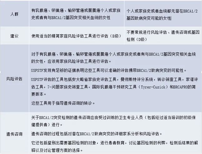 综上所述,遗传风险评估和 BRCA1/2 突变检测是一个多步骤的过程。所有 USPSTF 建议总结于下表: |