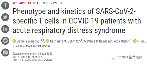 中重症患者的研究显示:新冠病毒特异性T细胞会较早出现,并随时间增加