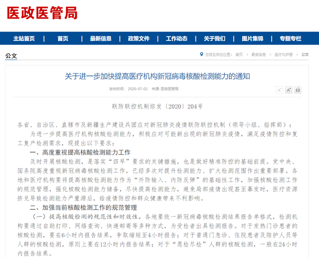 7月2日,为进一步提高医疗机构核酸检测能力,积极应对可能新出现的新冠肺炎疫情,满足疫情防控和复工复产检测需求,国务院应对新型冠状病毒肺炎疫情联防联控机制综合组发布《关于进一步加快提高医疗机构新冠病毒核酸检测能力的通知》(以下简称《通知》),对各地提出具体工作要求。 为应对可能新出现的新冠肺炎疫情,要求各地做好核酸检测应对准备。包括掌握本地区核酸检测资源和能力现状,做好核酸检测能力储备并制订应急预案,确保一旦出现疫情,能够迅速调集资源,短时间内迅速提高检测能力。《通知》要求各地和医疗机构要将提高核酸检测能力作为基础性工作,强化核酸检测能力储备,尽快提高检测能力,避免局部疫情出现甚至暴发时,医疗资源挤兑导至检测能力严重滞后,给疫情防控和群众健康带来不利影响。《通知》对于不同检测对象的核酸检测报告时间做出了详细要求。对于发热门诊患者的核酸检测,要在6小时内报告结果,争取缩短至4小时报告;对于普通门急诊、住院患者及陪护人员等人群的核酸检测,原则上要在12小时内报告结果;对于“愿检尽检”人群的核酸检测,一般在24小时内报告结果。各地要统一新冠病毒核酸检测结果报告单格式,检测机构要通过自助打印、网络查询、快递邮寄等多种方式,为受检者出具检测报告。各地要大力开展新冠病毒核酸检测培训,按照《新型冠状病毒肺炎实验室检测技术指南》《新冠病毒核酸检测技术人员培训方案》等文件要求,加强标本采集、保存和运输、标本接收整理、核酸提取、试剂使用、荧光定量等检测方法、结果报告、生物安全等全流程培训。通过培训,确保各环节操作规范,进一步提高检测技术水平。《通知》再次强调各地要全面加强医疗机构实验室能力建设,不得因核酸检测影响紧急救治。各地要加强三级综合医院、传染病专科医院的实验室建设,使其具备独立开展新冠病毒检测能力。加强其他二级以上医院、专科医院、医学检验实验室建设,使其逐步达到新冠病毒核酸检测条件。在县域内,要选择1家综合实力强的医疗机构予以支持,使县域内具备核酸检测能力。对于急诊抢救患者,要在积极抢救的同时进行检测,不得因核酸检测影响紧急救治。《通知》要求各地制订区域内核酸检测结果互认的规定,明确互认的条件、有效期、医疗机构范围等,最大程度减少重复检测。各省级卫生健康行政部门要组织辖区内检测机构参加室间质评,保证每家机构每年至少参加1次室间质评。各医疗机构要常态化接受国家级或省级临床检验质量控制,保证检测质量。关于进一步加快提高医疗机构新冠病毒核酸检测能力的通知各省、自治区、直辖市及新疆生产建设兵团应对新冠肺炎疫情联防联控机制(领导小组、指挥部):为进一步提高医疗机构核酸检测能力,积极应对可能新出现的新冠肺炎疫情,满足疫情防控和复工复产检测需求,现提出以下要求:及时开展核酸检测,是落实“四早”要求的关键措施,也是做好精准防控的基础前提。党中央、国务院高度重视新冠病毒核酸检测工作,已经多次对提升检测能力、扩大检测范围作出重要部署。各地和医疗机构要将提高核酸检测能力作为“外防输入、内防反弹”的基础性工作,加强核酸检测工作的规范管理,强化核酸检测能力储备,尽快提高检测能力,避免局部疫情出现甚至暴发时,医疗资源挤兑导至检测能力严重滞后,给疫情防控和群众健康带来不利影响。(一)提高核酸检测的规范性和时效性。各地要统一新冠病毒核酸检测结果报告单格式,检测机构要通过自助打印、网络查询、快递邮寄等多种方式,为受检者出具检测报告。对于发热门诊患者的核酸检测,要在6小时内报告结果,争取缩短至4小时报告;对于普通门急诊、住院患者及陪护人员等人群的核酸检测,原则上要在12小时内报告结果;对于“愿检尽检”人群的核酸检测,一般在24小时内报告结果。(二)持续开展核酸检测培训。各地要大力开展新冠病毒核酸检测培训,按照《新型冠状病毒肺炎实验室检测技术指南》《新冠病毒核酸检测技术人员培训方案》等文件要求,加强标本采集、保存和运输、标本接收整理、核酸提取、试剂使用、荧光定量等检测方法、结果报告、生物安全等全流程培训。通过培训,确保各环节操作规范,进一步提高检测技术水平。(三)推动医疗机构互认检测结果。各地要结合本地疫情防控需要,制订区域内核酸检测结果互认的规定,明确互认的条件、有效期、医疗机构范围等,最大程度减少重复检测。各省级卫生健康行政部门要组织辖区内检测机构参加室间质评,保证每家机构每年至少参加1次室间质评。各医疗机构要加强实验室室内质控,常态化接受国家级或省级临床检验质量控制,保证检测质量。(一)掌握本地区核酸检测资源和能力现状。各地要全面掌握本地区医疗机构实验室现状,了解可用于新冠病毒核酸检测的医疗资源情况,要细化到每一家机构掌握其最大检测能力和实际检测量,包括综合医院、专科医院和医学检验实验室等医疗机构的核酸提取仪、荧光定量PCR仪、生物安全柜等仪器设备的型号、通量及功能状态等,检测技术人员以及防护物资等。对于新申请开展新冠病毒核酸检测的医疗机构实验室,各地卫生健康行政部门要抓紧组织审核验收,对符合条件的及时进行批准,增