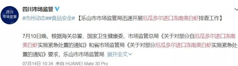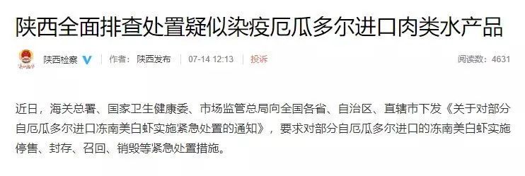 7月15日,重庆沙坪坝区新冠肺炎疫情防控工作领导小组发布通报称,7月14日,检测发现西部物流园一冷冻仓库部分厄瓜多尔冻南美白虾外包装新冠病毒核酸呈阳性。 沙坪坝区疫情防控工作领导小组第一时间对配送点、门店、消费者及相关接触人员进行全面排查,对物品进行封存,对接触人员进行隔离观察,并严格开展环境、物品和接触人员的核酸检测。 厄瓜多尔:已向中国保证履行程序 保证冻虾等出口产品安全性《环球时报》记者15日从厄瓜多尔驻华大使馆处了解到,就从该国进口的南美冻虾外包装上检测出新冠病毒一事,厄瓜多尔政府近期已同中国政府举行至少四次会见会谈,据该国外长路易斯•加耶戈斯称,厄方已向中国保证,将履行“必要程序”,以确保该国出口到国际市场的产品的安全性。 三部门已紧急通知:立即禁售厄瓜多尔冻南美白虾 早在7月10日,海关总署、国家卫健委、市场监管总局就已向全国各省、自治区、直辖市下发《关于对部分自厄瓜多尔进口冻南美白虾实施紧急处置的通知》,要求对部分自厄瓜多尔进口冻南美白虾实施紧急处置。 海关总署表示,对检出阳性的样本,经核酸序列分析并经专家研判,检测结果提示厄瓜多尔三家企业产品的集装箱环境、货物外包装存在被新冠病毒污染风险。专家研判认为,检出结果不代表具有传染性,但反映出相关企业的食品安全管理制度落实不到位。 多地拉响警报,紧急出手! 在浙江,截至7月11日上午,浙江省市场监管系统会同海关部门已对浙江省内进口商、经销商的77812.08千克自厄瓜多尔进口的冻南美白虾采取封存召回措施。 在广东,截至7月14日中午12点,广州、深圳、惠州、汕尾、湛江等5个市排查发现厄瓜多尔进口的涉事产品,停售、封存冻虾约82.3吨,针对性开展人员、产品、环境核酸检测共1041批次,结果均为阴性。 国家食品安全风险评估中心微生物实验室主任李凤琴此前表示,包括海鲜在内的所有的食物,它不会感染新型冠状病毒,但是可能存在着被新型冠状病毒污染的可能,目前还不能排除低温冷藏的食品和食品包装材料作为病毒的载体造成新型冠状病毒污染环境并引起人类传播的可能。 北京市疾控中心此前也给出建议,疫情期间应注意防范接触性传播: