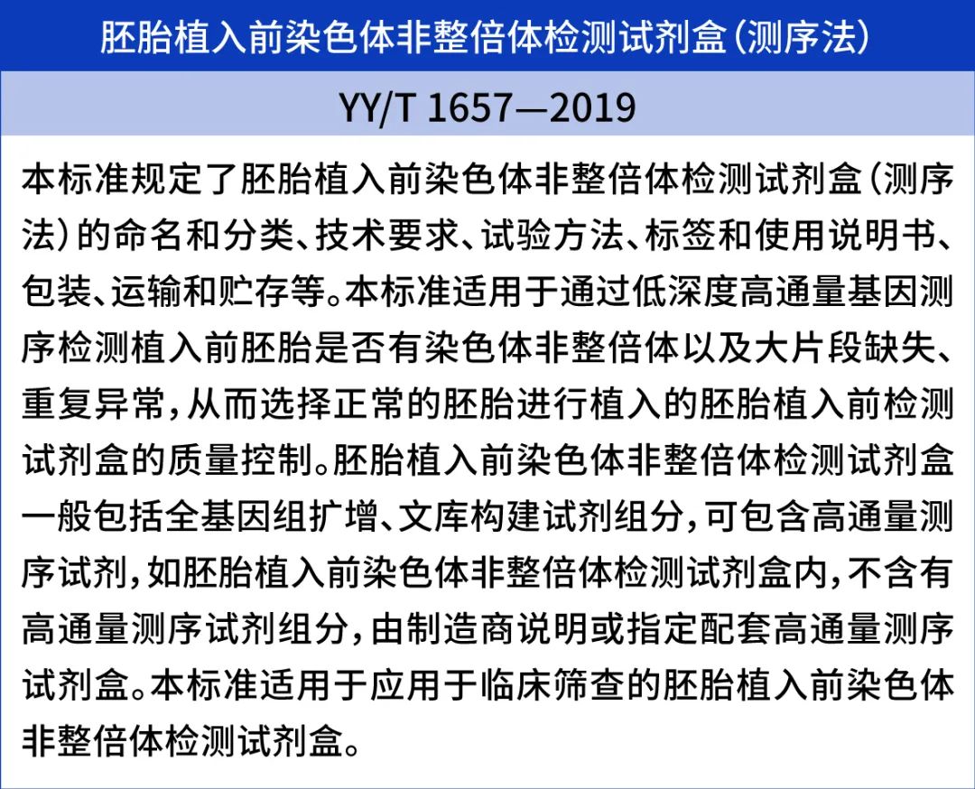 国家药监局发文,进一步加强医疗器械强制性行业标准管理 近日,国家药监局根据《中华人民共和国标准化法》、《医疗器械监督管理条例》、《强制性国家标准管理办法》和《医疗器械标准管理办法》,发文表示将重点从1.切实维护强制性行业标准的法律地位2.进一步完善强制性行业标准体系3.完善强制性行业标准起草和实施4.加强强制性行业标准的宣贯培训5.规范强制性行业标准的执行6.强化强制性行业标准的实施评估这六个方面,进一步统一对强制性行业标准的认识,切实推进医疗器械强制性行业标准规范、有效实施。 《医疗器械监督管理条例》第六条规定“医疗器械产品应当符合医疗器械强制性国家标准;尚无强制性国家标准的,应当符合医疗器械强制性行业标准。”各有关单位要充分认识强制性行业标准的法律地位,切实维护强制性行业标准的权威性,确保强制性行业标准规范、有效实施。  Ⅲ类医疗器械是最高级别的医疗器械,也是必须严格控制的医疗器械,是指植入人体,用于支持、维持生命,对人体具有潜在危险,对其安全性、有效性必须严格控制的医疗器械。 PGT-A试剂盒属于Ⅲ类医疗器械,按照国家医疗器械相关法律强制性规定,任何医疗机构(包括医院、医学检验所、医学检验中心等)在开展临床应用项目时,均应当使用有注册证的医疗器械,产品开发依托的平台也必须获得三类医疗器械注册证。 2014年2月,国家药监局和卫健委联合发布《关于加强临床使用基因测序相关产品和技术管理通知》,明确了基因测序诊断产品属于医疗器械,要求其按规定申请产品注册,并强调“未获准注册的医疗器械产品,不得生产、进口、销售和使用”。 通知中还明确要求,基因测序需要应用的检测仪器、诊断试剂和相关医用软件等产品,需要经过食品药品监管部门审批注册,并经卫生计生行政部门批准技术准入。 据国家药品监督管理局官网发布的公示显示,目前国内已有PGT-A试剂盒获批上市。今年 2 月,苏州贝康医疗器械有限公司研发的PGT-A三代试管检测试剂盒得到了国家监管层面的认可,获得上市批准(国械注准:20203400181)。 该试剂盒是国内首个获批的PGT-A检测产品,填补了我国三代试管应用的技术空白,标志着三代试管PGT -A检测正式进入有证时代,也弥补了国内无合法三代试管产品的窘境。临床试验数据显示,PGT-A产品能够将试管婴儿平均妊娠率提升至72%,平均流产率降低至6.9%。