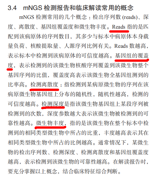 mNGS报告通过测序短序列的数量(reads)进行物种的鉴定,碱基序列片段数量越大,表明该物种在样本中存在的可能性越高,但需要区分不同物种。同时需要考虑基因组的覆盖度,覆盖度与可信度呈正相关,但并非呈线性正相关。具体参考2019年的专家指南中mNGS检测的专有名词解释。