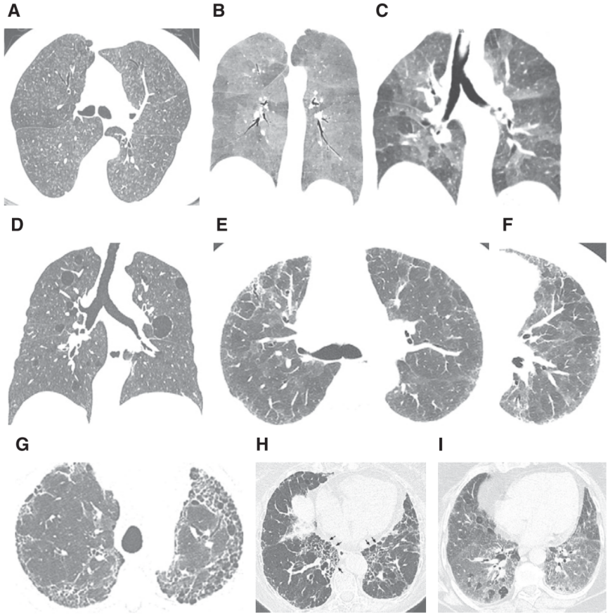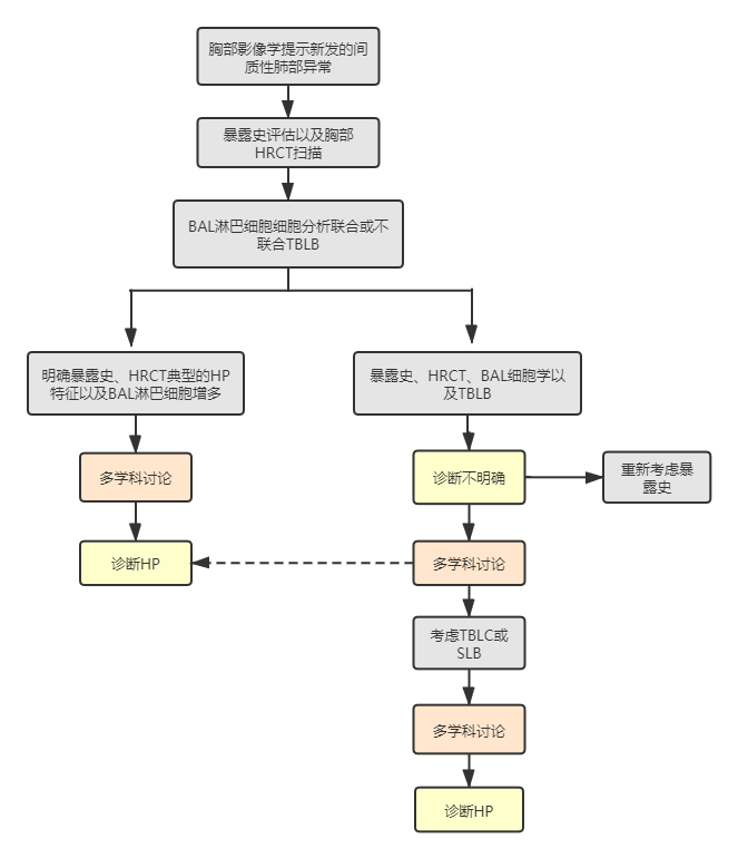 | 过敏性肺炎(HP)是一种累及肺实质和小气道的炎性和/或纤维性疾病,易感人群暴露于已知或未知抗原后,诱发机体细胞免疫和体液免疫介导肺部炎症反应。随着致病抗原暴露频率、持续时间和强度的不同,HP的严重程度、临床表现及自然病程复杂多变,而不是一种单一的疾病。由于缺乏HP的临床实践指南,不同国家和地区对于HP的诊断标准难以达成共识,许多临床医师仍然在沿用30年前的HP临床评估指南[1]。为此,美国胸科协会(ATS)联合日本呼吸学会(JRS)以及拉丁美洲胸科协会(ALAT)在今年共同发布了《2020版成人过敏性肺炎诊断指南》[2]。千呼万唤始出来,今天小编就来带大家一起来看看这版HP诊断指南究竟有何独到之处。多年来,大家一直沿用1989年的HP临床评估指南,将HP分为急性、亚急性和慢性HP,此后很多学者提出了其他几种不同的分类方法,但由于HP的临床表现和病程有很大的差异和重叠,这些分类方法都不能完全令人满意。Vasakova等[3]在2017年提出将HP分为急性/炎症性HP和慢性/纤维性HP。急性/炎症性HP的症状持续时间不到6个月、病变可逆且影像学表现以磨玻璃阴影为主;慢性/纤维性HP的症状持续时间超过6个月、病变相对不可逆、进展几率更大且影像学显示网状影和蜂窝征。由于影像学和组织病理学是否出现纤维化是决定HP预后的首要因素,2020版HP诊断指南将HP分为两种类型:非纤维性HP(单纯炎性病变)和纤维性HP(炎性病变合并纤维化或单纯纤维化)。尽管非纤维性HP通常起病较急,而纤维性HP起病更为隐匿,但是两者在临床表现上并没有严格的差异,存在一定的重叠,鉴别两种类型的关键在于放射影像学和组织病理学上的差异。HP的放射影像学特征取决于诊断时所处的疾病阶段,HRCT的表现因组织病理学的改变而不同,但是HRCT的特征性表现是以中上肺野为主的小叶中心性磨玻璃样或结节样不透光区伴空气潴留征。非纤维性HP在HRCT上的典型表现为同时存在肺实质浸润征象和小气道疾病,通常累及双侧肺野且呈弥漫性对称分布。HRCT的肺实质浸润征象包括磨玻璃样不透光区(GGO)和马赛克衰减。小气道疾病则包括边界不清的小叶中央型小结节(<5mm)和空气潴留征(比较吸气相与呼气相的图像可证实空气潴留征)。纤维性HP在HRCT上的典型表现为同时存在肺纤维化和小气道疾病,主要分布于中上肺野,下肺野相对正常。肺纤维化在HRCT上的特征包括小叶间隔增厚、牵拉性支气管扩张和蜂窝征,相比特发性肺纤维化(IPF),其主要位于肺底的情况较少见。小气道疾病则包括小叶中央型小结节(<5 mm)和/或GGO、马赛克衰减、肉皮冻征和/或空气潴留征(通常位于小叶分布区)。  (图1 HP的HRCT特征:A-小叶中央型结节;B-吸气相马赛克衰减;C-呼气相空气潴留征;D-GGO和囊性变;E-随机分布的蜂窝征;F-小气道疾病;G-上肺分布为主的蜂窝征;H-支气管血管束分布的蜂窝征;I-磨玻璃密度衰减与小气道疾病同时存在)肺活检在明确诊断HP中发挥了至关重要的作用,病理标本的获取方式包括经支气管肺活检(TBLB)、经支气管冷冻活检(TBLC)以及手术肺活检(SLB)。非纤维性HP和纤维性HP的关键差异在于组织病理学上有无纤维化表现。典型非纤维性或细胞性HP通常至少1处活检组织病理提示以下3种特征:1、细胞性间质性肺炎:细胞性NSIP的特征、淋巴细胞浸润为主;