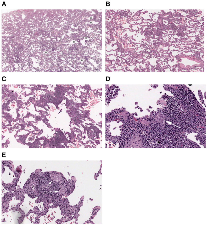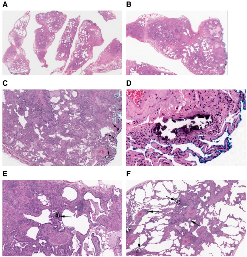 2、细胞性细支气管炎:支气管周围淋巴细胞浸润为主(淋巴细胞>浆细胞)±机化性肺炎的特征±泡沫状巨噬细胞;3、松散的非坏死性肉芽肿:疏松分布的上皮细胞和/或多核巨细胞、位于呼吸性细支气管或终末细支气管处。