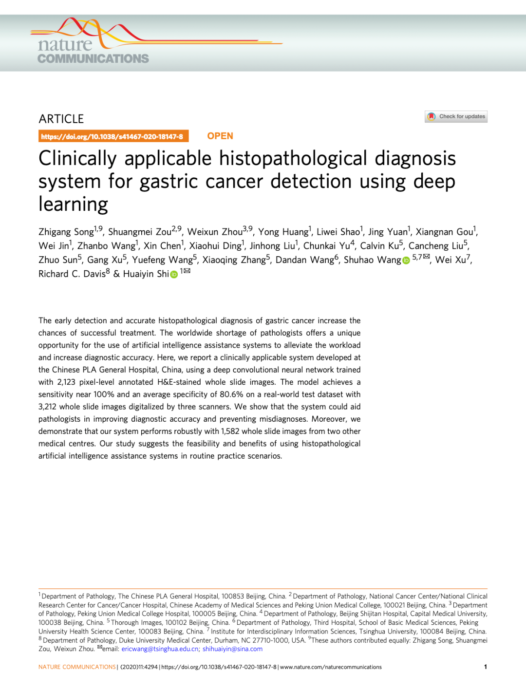 8月27日,中国解放军总医院、中国医学科学院肿瘤医院、北京协和医院联合透彻影像开展的人工智能胃癌病理辅助诊断多中心研究成果「Clinically applicable histopathological diagnosis system for gastriccancer detection using deep learning」在Nature Communications发表。这是中国研究团队在病理人工智能领域发表的顶级学术成果,也是全球首个可应用于复杂器官临床病理诊断的人工智能系统。 病理诊断是肿瘤类疾病的最终诊断,被称为医学诊断的“金标准”,病理医师被称为“医生的医生”。病理医师的责任重大,对疾病的诊断不能出现差错。病理医师不仅要有丰富的临床经验,还必须掌握影像学、分子学等方面的知识,病理医师的成长期往往需要5到10年的时间。目前全国有执照的病理医师在1万人左右,人才缺口高达近9万人。胃癌是威胁人类健康的恶性肿瘤之一,病理诊断在胃部疾病早期筛查和精准诊断发挥着重要的作用,准确的病理学诊断能够显著地降低胃癌的死亡率。在全球范围内,由于病理医师人数的严重缺乏,加之胃部活检和手术标本的样本量大,胃部病理的诊断工作为病理科带来了巨大的压力,这一矛盾在胃癌发病率较高的亚洲愈加凸显。为了满足临床治疗的需求,快速提供诊断结果,病理医师承担着超负荷的诊断工作量,误诊的发生在所难免。