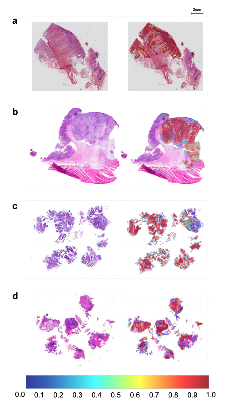 图3. 深度学习模型在解放军总医院数据上的表现,在三个月的连续样本上,模型展示出了较好的准确率,与此同时,模型在三款不同品牌的切片扫描仪上的表现较为稳定基于图像分割技术的深度神经网络在解放军总医院的连续胃部样本上达到了99.6%的敏感度和84.3%的特异性,仅有一张阳性切片预测概率低于严格的阈值,根据双阈值策略,被划入待审核样本,交予病理医师审核。在所有样本上,人工智能系统均能够以较高的敏感度提示出癌变区域,从而防止漏诊的发生。通过对比模型在三款病理切片扫描仪上的表现,可以看到模型均表现出极高的敏感度和超过80%的特异性。这表明系统具有良好的兼容性,在采用不同品牌的扫描仪的医院终端均可以使用。