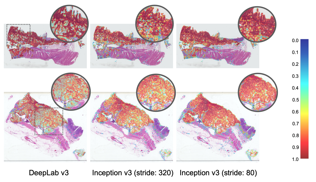 图4. 模型预测结果,癌区使用热力图来表示  图5. 图像分割与分类模型预测结果对比,能够看到图像分割模型能够更加清晰地展示病变区域人工智能系统不仅可以作为辅助病理医师的工具,而且可以提供有效的第二意见。在病理诊断中,疑难样本通常会使用免疫组化在进行更深入的诊断。深度学习模型在这些样本上能够达到超过80%的准确率,并正确提示出了高风险区域,指导病理医师执行免疫组化等进一步诊断。