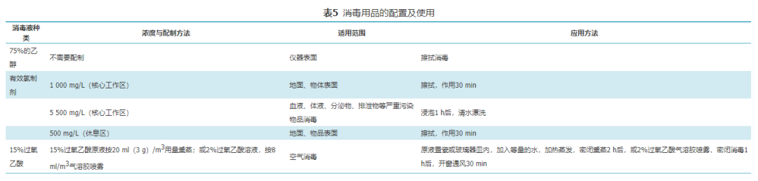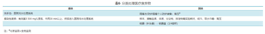 (二)开展2019-nCoV实验活动生物安全风险与防控措施从事2019-nCoV实验活动的生物安全风险与防控措施,见表3。 表3 从事2019新型冠状病毒实验活动的生物安全风险与防控措施从事2019-nCoV临床检测项目需要的个人防护见表4。 表4 从事2019新型冠状病毒临床检测项目需要的个人防护洗手→防护帽→N95口罩(闭合性测试)→防护服→靴套→护目镜→内层手套→隔离衣→外层手套。外层手套→隔离衣→靴套→护目镜(放入消毒桶)→防护服→鞋套→内层手套防护帽→N95口罩→洗手。(一)按照实验区域和实验活动消毒用品正确配制和使用[9,10]消毒用品的配置及使用见表5。注意:建议每天配制消毒液。双层医疗废弃物袋及锐器盒过满,建议医疗废弃物袋达到1/2,锐器盒达到3/4进行处理。擦拭仪器表面,含有仪器的按键。抹布专区专用,使用完毕,要1 000 mg/L有效氯浸泡。双层手套擦拭,擦拭完毕脱外层手套,更换新手套。含氯消毒剂正确使用,防止对人员黏膜及血液系统造成二次伤害。75%乙醇,燃点低,注意消防安全。含氯消毒剂对金属有腐蚀,擦拭金属后,需要清水再次擦拭。 分类处理医疗废弃物见表6。注意:高压灭菌器需要年检,大容积的非快开门式高压灭菌器需要"特种设备作业人员证"。医疗垃圾袋双层包装,贴有标识,不可装载过满。高压后医疗废弃物需要专门的医疗垃圾转运箱及转运车运送,每日对医疗垃圾桶、转运箱及转运车进行消毒。高压洗消间,设立窗户,安装紫外灯及灭蚊灯,一层及地下室必要时安装防鼠板。