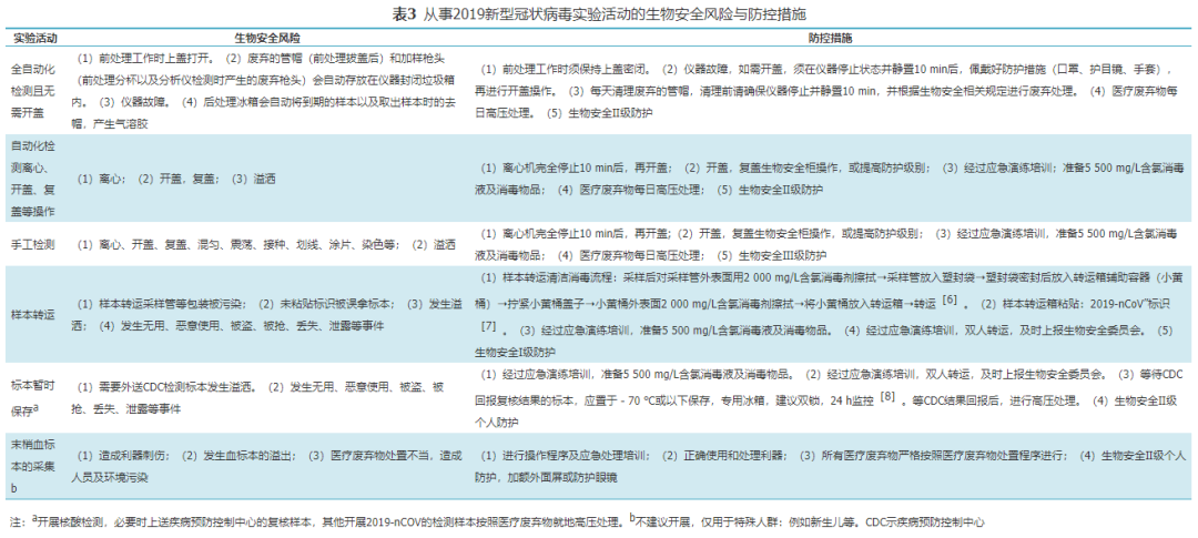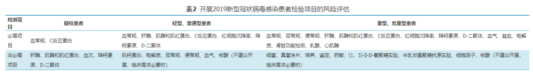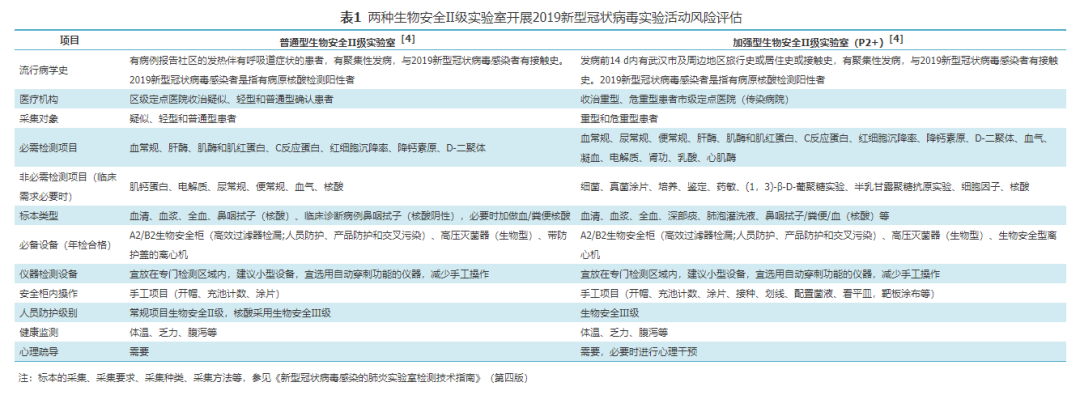 门把手、电梯按钮、电话等公共设施,用75%酒精或者500 mg/L有效氯制剂消毒。操作人员须被告知实验室工作的危险性并接受实验室安全防护培训,自愿从事实验室工作,接受并通过培训后,经过考核,上岗工作。实验操作须遵守实验室的所有制度、规定和操作规程。管理人员均有从事感染实验室的管理经验及一般的微生物学知识。二、2019-nCoV不同生物安全Ⅱ级实验室分层风险评估 两种生物安全Ⅱ级实验室开展2019-nCoV实验活动风险评估见表1。 表1 两种生物安全Ⅱ级实验室开展2019新型冠状病毒实验活动风险评估临床医生需要进行鉴别诊断,主要与流感病毒、副流感病毒、腺病毒、呼吸道合胞病毒、鼻病毒、人偏肺病毒、SARS冠状病毒等其他已知病毒性肺炎鉴别;与肺炎支原体、衣原体肺炎及细菌性肺炎等鉴别。此外,还要与非感染性疾病,如血管炎、皮肌炎和机化性肺炎等鉴别[5]。三、2019-nCoV不同实验活动的风险评估和预防措施 (一)开展2019-nCoV感染患者检验项目的风险评估开展2019-nCoV感染患者检验项目的风险评估见表2。注意:疑似患者尽量减少不必要的开展或在排除2019-nCoV感染后再进行。 表2 开展2019新型冠状病毒感染患者检验项目的风险评估