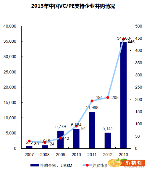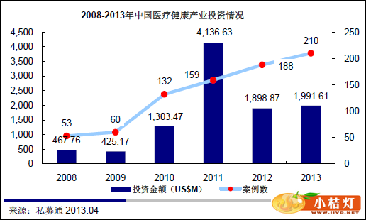 健康产业是当下的一个朝阳产业,已同TMT已成为PE/VC投资最为活跃的两个领域。根据清科研究中心统计数据显示,2013年VC/PE共投资了210家医疗健康企业,为2008年以来最高。投资金额总计19.9亿美元,仅低于“全民PE”火热的2011年。2013年医药投资涉及企业大概80多家,医疗设备50多家,医疗服务是29家,其他有12家。其中,医疗服务的投资是呈现快速增长,2013年已经有29家医疗服务企业获得融资。