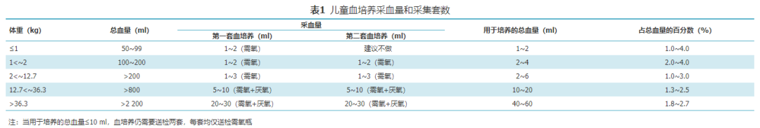通常情况下建议每次采集2~3套血培养,2~5 d内无需重复采集,特殊情况(怀疑感染性心内膜炎或导管相关血流感染)除外。另外,对于新生儿在体重和总血容量允许的情况下,尽量采集2套血培养(一般每套血培养标本采集1瓶儿童需养瓶,如有可疑厌氧菌感染的临床指征,则需要采集厌氧血培养);如果新生儿体重和总血容量不允许的情况下,可采集1瓶儿童需氧瓶,并且建议根据临床需要同时进行脑脊液或尿液培养[9,10,11]。