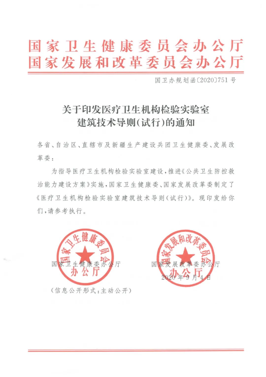 为指导医疗卫生机构检验实验室建设,推进《公共卫生防控救治能力建设方案》实施,国家卫生健康委、国家发展改革委制定了《医疗卫生机构检验实验室建筑技术导则(试行)》。