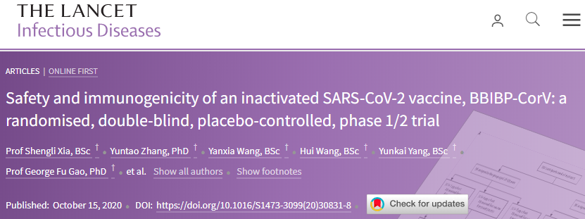 参考资料 [1] Shengli Xia, et al., (2020). Safety and immunogenicity of an inactivated SARS-CoV-2 vaccine, BBIBP-CorV: a randomised, double-blind, placebo-controlled, phase 1/2 trial. The Lancet Infectious Diseases, DOI: https://doi.org/10.1016/S1473-3099(20)30831-8 [2] The Lancet Infectious Diseases: Preliminary results find vaccine candidate based on inactivated SARS-CoV-2 virus is safe and induces an immune response in healthy volunteers. Retrieved October 16, 2020, from https://www.eurekalert.org/pub_releases/2020-10/tl-pss101520.php [3] 中国生物. Retrieved October 16, 2020, from https://www.cnbg.com.cn/
