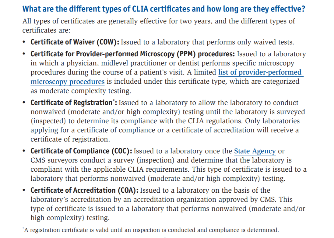 当然药厂还有会有额外的诉求,例如最好试验数据还能全球复用(比如中国的临床试验数据可以支撑其全球注册),这里面就要求是产品质量经得起全球考验(最好来个头对头比较,最近有个FDA-SEQC2研究的结果很快会发布,大家可以关注下),比如是否有全球认可的体系认证(常见的就是CLIA和CAP,虽然目前都不算难拿,但有总比没有好。最近学习到,CLIA认证分为COR、COA和COC三种,真是奇奇怪怪的知识又增加了)