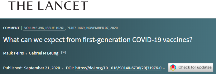 ▎药明康德内容团队编辑 想要减轻防控压力,恢复疫情前的生活,新冠疫苗被寄予厚望。根据世界卫生组织最新统计,目前全球共有47款候选新冠疫苗正在人体中开展临床试验,其中10款已经进入3期试验阶段。部分疫苗有望在2020年底或2021年初公布结果并获批上市。 然而,随着首批疫苗上市,就能帮助我们建立起群体免疫吗?在新一期《柳叶刀》的评论文章中,香港大学公共卫生医学系主任Gabriel Leung教授和病毒学家Malik Peiris教授直言:“第一代疫苗不太可能成为终极解决方案。”在这篇文章中,两位专家探讨了对第一批新冠疫苗作用和影响的合理期望。