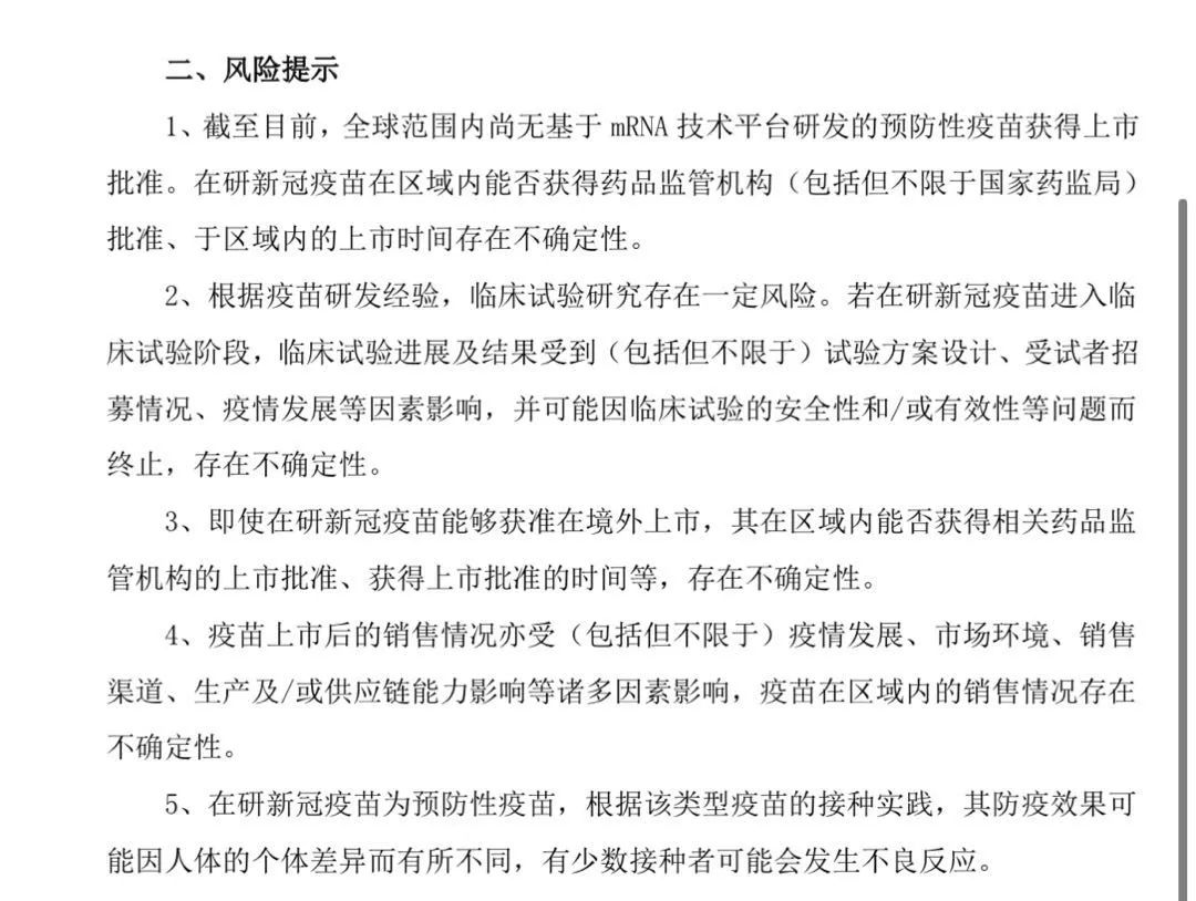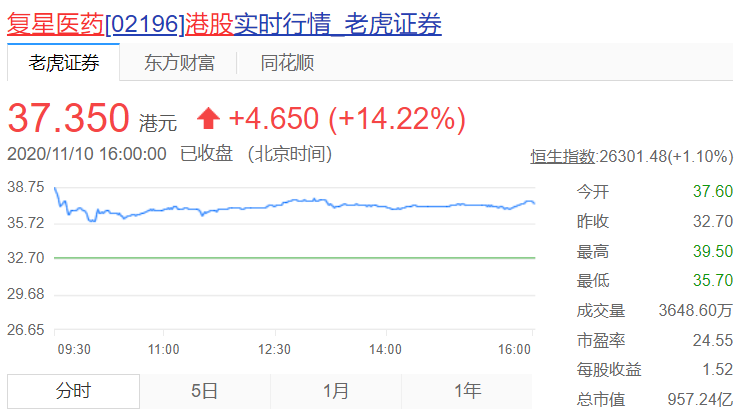 就在11月9日晚间,美国辉瑞公司(NYSE: PFE)和德国拜恩泰科(BioNTech)宣布,根据三期临床试验的初步分析数据,联合研发的mRNA疫苗有效率高达90%,而普通流感疫苗也只有70%左右的保护率,远超此前的预期,更远远高于FDA要求的50%以上即可获批上市。 这则关于新冠疫苗的重大突破消息引发市场关注。 值得一提的是,复星医药是BioNTech mRNA新冠疫苗在大中华区的研发合作伙伴。 受到该消息影响,11月10日,A股复星医药(600196.SH)开盘即涨停,报56.66元。港股复星医药(02196.HK)盘中一度大涨超过20%,收盘涨幅14.22%。 10日,复星医药发布公告,公司控股子公司复星医药产业获BioNTech授权在区域内开展mRNA新型冠状病毒疫苗产品的开发和商业化。复星医药产业与BioNTech就新冠疫苗在区域内的合作在有序推进中。 截至目前,全球范围内尚无基于mRNA技术平台研发的预防性疫苗获得上市批准。在研新冠疫苗在区域内能否获得药品监管机构批准、于区域内的上市时间存在不确定性。 据了解,今年3月,复星医药获得BioNTech授权,在中国大陆及港澳台地区独家开发、注册、商业化基于其专有mRNA技术平台研发的、针对新型冠状病毒的复星新冠疫苗(暂定名“复必泰”),并于7月在国内启动临床试验。 对于mRNA疫苗的进展情况,11月10日中午,复星召开电话会议,复星国际(0656.HK)董事长郭广昌、复星医药董事长吴以芳、复星医药全球研发中心总裁回爱民、复星旅文(1992.HK)董事长钱建农等均参会。