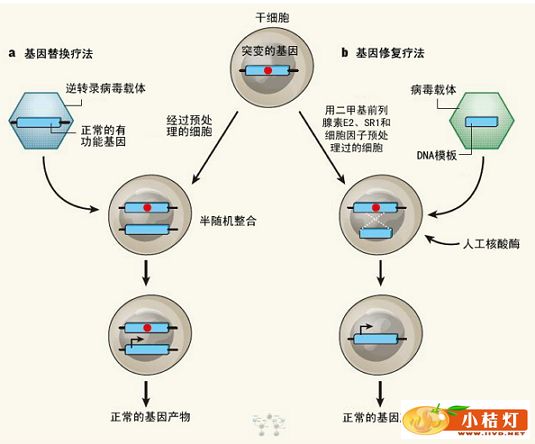 40多年来,基因疗法一直都被大家看作是治疗基因缺陷遗传性疾病的手段之一。 基因疗法是基因发生突变的干细胞经过预处理之后进行基因替换治疗。用于替换细胞内突变基因的正常基因经由逆转录病毒载体进入细胞内,以半随机方式整合到细胞基因组内,表达正常的基因产物,行使该基因的正常功能。 基因修复疗法是人工核酸酶能够在突变基因位点处对DNA链进行切割,形成DNA链断裂切口。利用病毒为载体,将编码正常基因的DNA模板链导入经过预处理的细胞内。细胞会利用同源重组机制,以外源的正常DNA链为模板,完成基因修复工作,如图中白色虚线所示。Genovese等人优化了HSC细胞的预处理方案,使用二甲基前列腺素E2和SR1防止细胞早期分化,同时使用细胞因子降低细胞对核酸酶的敏感性,减少核酸酶对细胞的毒副作用。 最典型的基因治疗就是利用人工改造过的逆转录病毒载体(retroviral vector)往患者患病细胞的基因组中插入一个有功能的基因,代偿缺陷基因的功能,如图1a所示,即所谓的基因替换疗法。虽然已经利用这种添加外源基因的方法治疗过某些遗传性疾病,比如严重的联合免疫缺陷病(severe combined immunodeficiencies),并且取得过非常好的治疗效果,但是副作用也同样非常明显。因此有人提出了基因修复方案,Genovese等人将为我们带来基因修复技术的最新发展概况。