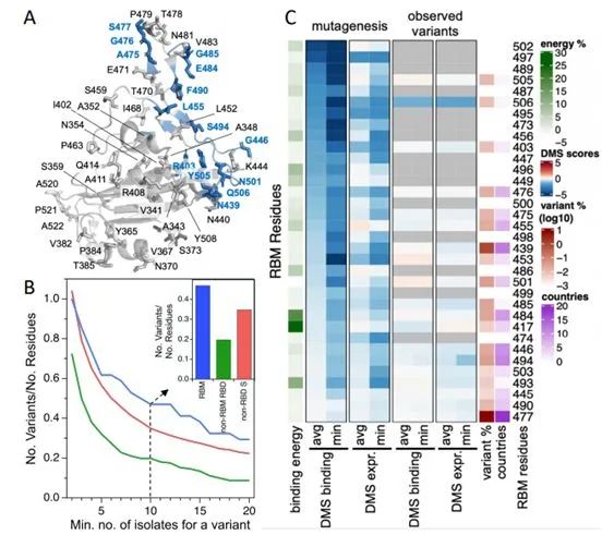 新型冠状病毒SARS-CoV-2的一种广泛变体有可能躲过一些人在感染后产生的免疫反应。自这次大流行开始以来,科学家们在从感染者身上采集的SARS-CoV-2样本的基因组中发现了数千种病毒突变。 在一项新的研究中,英国格拉斯哥大学的David Robertson、美国Vir生物技术公司(Vir Biotechnology)的Gyorgy Snell及其同事们研究了这种病毒用来入侵宿主细胞的刺突蛋白(S蛋白)中发生的一种称为N439K的突变。相关研究结果于2020年11月5发表在bioRxiv预印本服务器上,论文标题为“The circulating SARS-CoV-2 spike variant N439K maintains fitness while evading antibody-mediated immunity”。 图片来自bioRxiv, 2020, doi:10.1101/2020.11.04.355842。 这种突变影响了S蛋白的受体结合结构域(RBD),其中S蛋白利用它的受体结合结构域识别宿主细胞,因而这个受体结合结构域是抗病毒抗体的关键靶点。该突变已经独立出现了至少两次,并且已经在12个国家被发现。 在实验室实验中,这些研究人员发现,这种突变可以抑制阻断这种病毒的强效中和抗体的活性。在受到这种突变抑制的中和抗体中,有从COVID-19中康复的人血液中的抗体,以及一些正在作为药物开发的“单克隆抗体”。 由此可见,维持SARS-CoV-2毒力和适应度(fitness)的N439K等免疫逃逸突变出现在SARS-CoV-2的S蛋白中,这凸显了持续进行分子监测的必要性,以指导疫苗和药物的开发和使用。 |