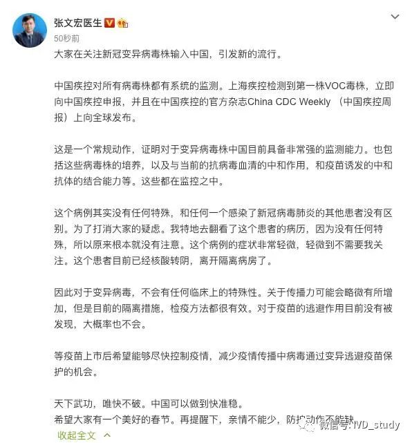 1月1日晚,上海复旦大学附属华山医院感染科主任张文宏在其个人微博发文称,上海疾控检测到第一株VOC毒株,立即向中国疾控申报,并且在中国疾控的官方杂志China CDC Weekly (中国疾控周报)上向全球发布,“这是一个常规动作,证明对于变异病毒株中国目前具备非常强的监测能力”。