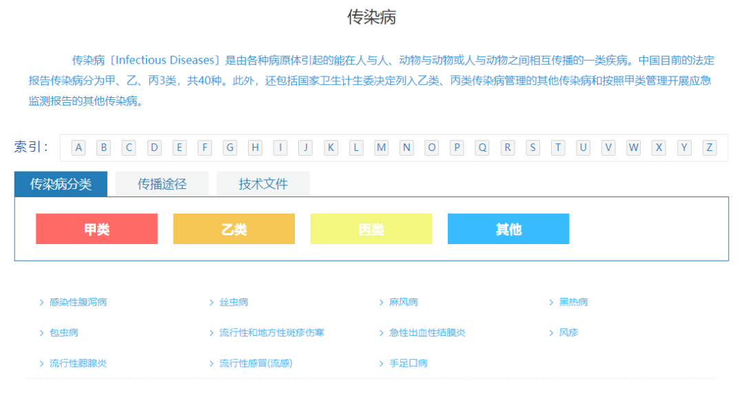 传染病〔Infectious Diseases〕是由各种病原体引起的能在人与人、动物与动物或人与动物之间相互传播的一类疾病。中国目前的法定报告传染病分为甲、乙、丙3类,共40种。此外,还包括国家卫生计生委决定列入乙类、丙类传染病管理的其他传染病和按照甲类管理开展应急监测报告的其他传染病。具体分类及名称如下: