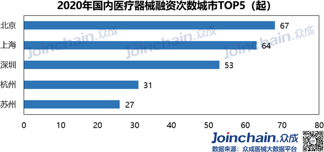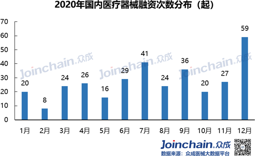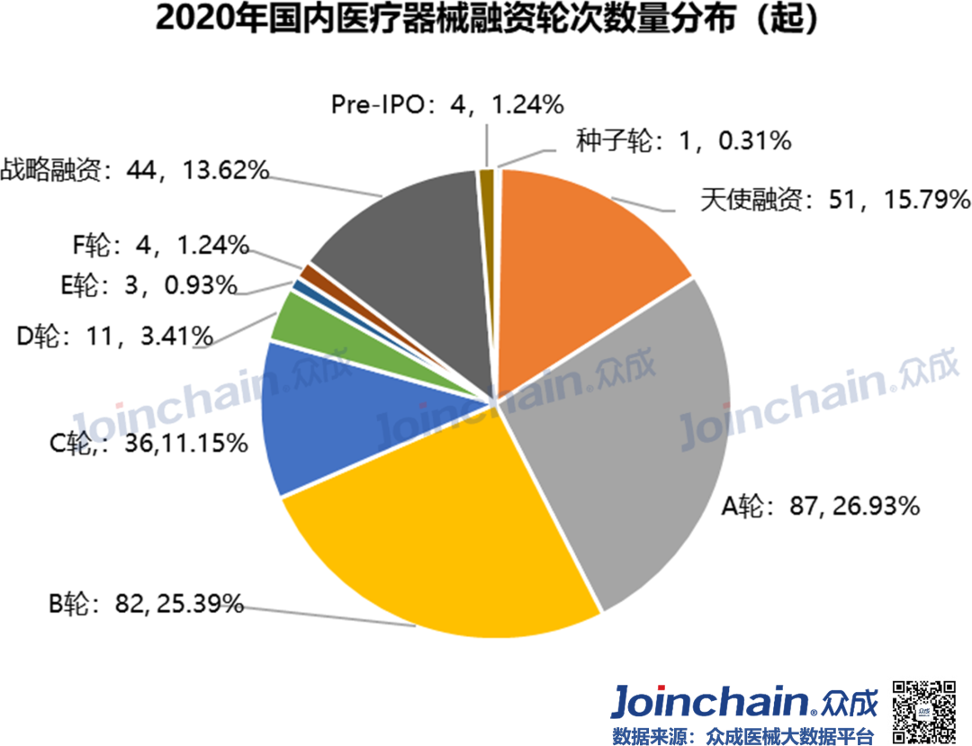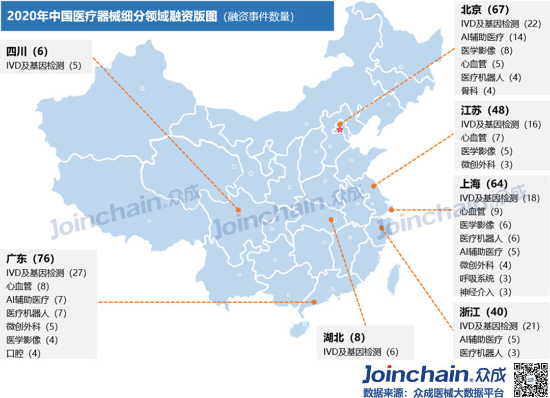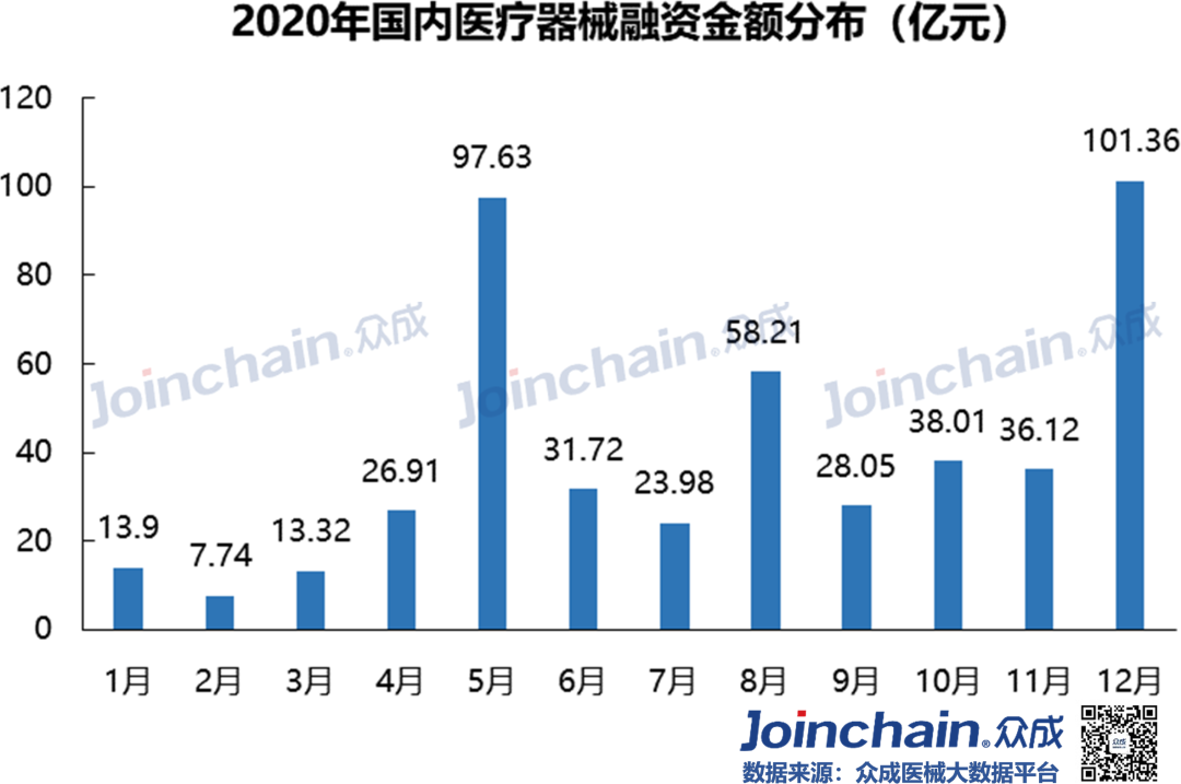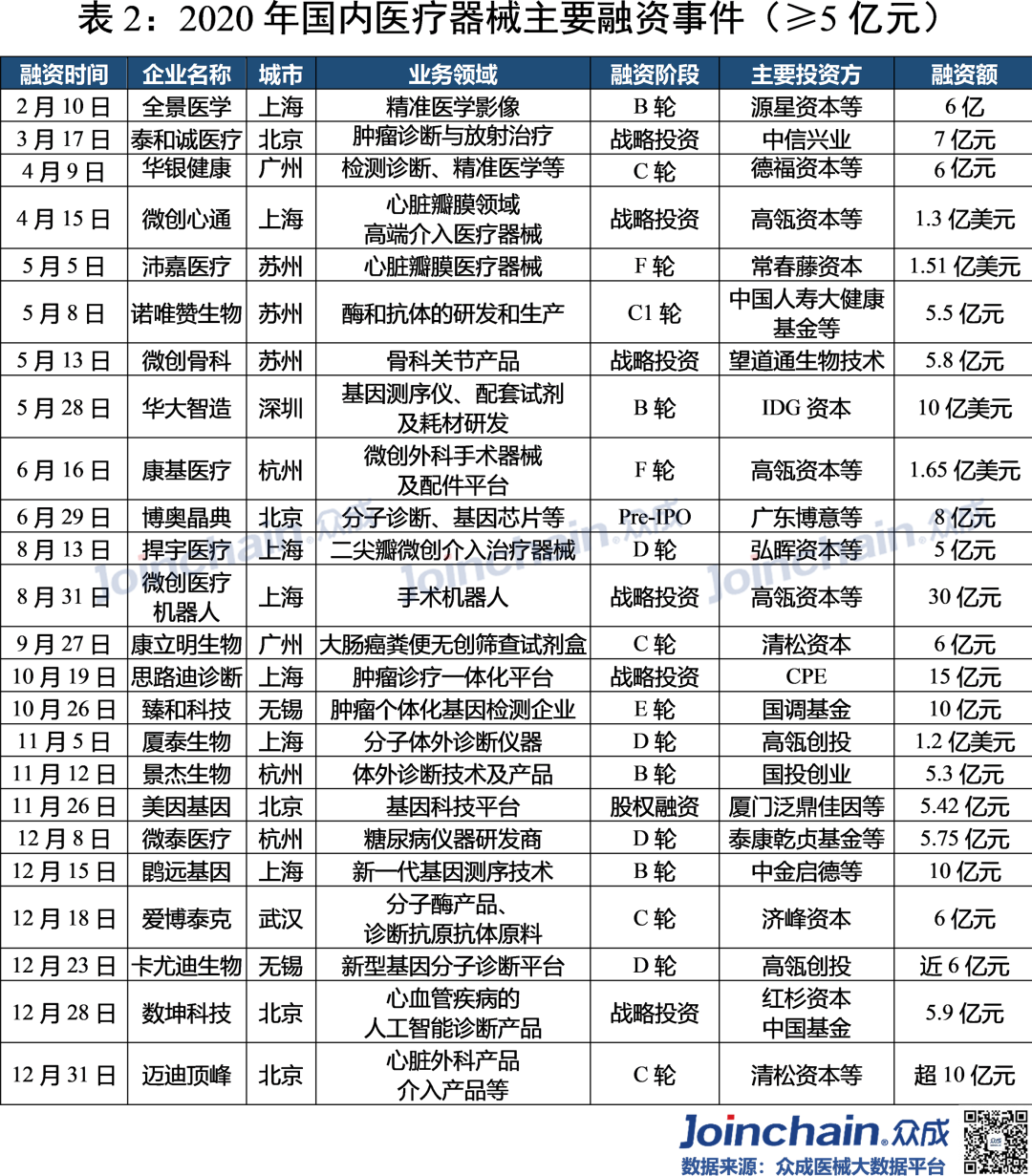 2020年疫情“黑天鹅”突袭,实体经济受到重创,资金募集脚步放缓。在防“疫”、战“疫”过程中使用的医疗器械高达上百种,包括口罩、防护服、呼吸机、监护仪、超声诊断仪、输液泵等。作为疫情下最热门的领域,医疗器械在资本市场呈现“逆流之势”。众成医械研究院基于大数据平台,完成2020年国内医疗器械融资分析,与各位读者分享。 概况: 融资事件达330起,融资规模近480亿元 据众成医械大数据库不完全统计,2020年国内医疗器械领域共发生了330起融资事件,融资规模达476.96亿元(不包括IPO、定向增发等)。 从全年来看,第一季度受疫情影响,医疗器械融资经历低潮之后回暖,并在12月份迎来融资高峰。四月份开始每月融资金额均超过20亿元,其中,5月份华大智造完成超过10亿美元B轮融资,带动当月总融资金额超97亿元,8月份微创医疗机器人完成30亿元战略投资,带动当月总融资金额接近60亿元。12月融资事件数量达到全年峰值(59件),鹍远基因和迈迪顶峰等十亿级融资事件,推动当月融资金额突破100亿元。 细分:IVD、心血管热度不减,AI与机器人成投资新宠 从融资次数看,2020年IVD及基因检测领域融资事件达121起,占比超过36%;心血管(33起)、医学影像(26起)等国产替代重点领域仍是投资热点;在医疗智能化趋势与应用场景逐步拓宽的背景下,AI辅助医疗与医疗机器人等领域获资本追捧,融资事件分别达33起、23起;此外,辅助生殖、医疗器械CRO等新瞩目赛道逐渐出现。 从融资规模看,IVD及基因检测领域融资额超245亿元,占比超51%;心血管领域融资额超65亿元,占比超13%;医疗机器人超40亿元;AI辅助医疗和医学影像等领域融资额均超过20亿元。 轮次:A、B轮次相对密集,战略投资多属IVD领域 在2020年国内医疗器械领域330起融资事件中(不含IPO、定增等),融资事件多集中在A轮与B轮阶段,数量分别为87、82起,合计占比超52%;此外,天使融资、战略融资和C轮融资事件均在35起以上。 IVD及基因检测、心血管、医学影像和AI辅助医疗等热门领域,融资项目多处于A、B轮阶段;处于战略投资阶段的企业超过三分之一为IVD及基因检测领域。 区域:北上广融资最为活跃,上海深圳均突破百亿元 2020年国内医疗器械领域融资项目主要分布在沿海发达地区,且长三角相对密集。 从融资数量看,在省份层面,广东省以76起的融资事件位居第一;北京和上海均超过60起,分别为67起和64起;江苏和浙江分别为48和40起;大部分省份融资事件居0~2起之间。在城市层面,深圳市以53起的融资数量紧追北京市和上海市,杭州和苏州则分列第四(31起)和第五(27起)。 从融资规模看,在省份层面,广东省以132.77亿元的融资规模居于全国首位;上海市(128.8亿元)、北京市(82.55亿元)、江苏省(67.4亿元)和浙江省(46.64亿元)占据前五,其余省份融资规模均在8亿元以下。 在城市层面,上海市和深圳市的融资规模均突破百亿元,杭州市、苏州市、广州市、无锡市、南京市、武汉市和宁波市进入前十。 从细分领域看,在IVD及基因检测领域,广东省融资项目最为密集,北京市和浙江省均超过20起;在AI辅助医疗领域,北京市融资事件最多(14起);医疗机器人领域,广东省融资事件最多(7起)。 典型:华大智造刷新行业纪录,23家器械领域企业IPO 华大智造:获得国内基因领域最大融资额。5月28日,深圳华大智造科技有限公司宣布完成B轮融资,领投方为IDG资本和CPE,融资额超过10亿美元,这是继2019年5月首轮募资后,华大智造完成的第二轮大规模融资,同时也创下近年国内基因领域最大私募融资金额纪录。公司为华大集团旗下子公司,成立于2016年,是全球三家能自主研发并量产临床高通量基因测序仪的企业之一。 微创医疗机器人:获得国内医疗机器人领域最大融资额。8月31日,上海微创医疗机器人(集团)股份有限公司完成30亿元战略投资,包括15亿元的直接增资以及15亿元的股权转让。投资方是高瓴资本、远翼投资、易方达基金等。公司成立于2015年,专注于手术机器人的研发与产业化突破,业务覆盖腔镜、骨科、血管介入、自然腔道、经皮穿刺五大“黄金赛道”。2020年12月31日,公司与中金签署上市辅导协议,拟于科创板上市。 鹍远基因:获得国内癌症早筛领域最高融资额。12月15日,上海鹍远生物技术有限公司完成近10亿元B轮融资,由中金资本旗下的中金启德创新生物医药基金领投,德同资本、复容投资共同领投。公司成立于2014年,致力于开发基于高通量测序和甲基化技术的肿瘤早期筛查和诊断产品。公司正在积极为其核心产品常乐思准备FDA申报。 迈迪顶峰:获得2020年心血管器械领域最大融资额。12月31日,北京迈迪顶峰医疗科技有限公司完成超过10亿元C轮融资。由清松资本和兰馨亚洲共同领投。公司成立于2005年,围绕着心血管疾病开发医疗设备及高端耗材。完成本轮融资后,公司将集中精力加强产品的市场开发力度,着力深化科研创新,强化公司在心脏外科产品、介入产品和生物制品的市场和技术领先地位。 2020年IPO数量同比增长64%,第三季度IPO最为密集。2020年医疗器械领域IPO企业数量达23家,相比于2019年的14家同比增长64%。从月份看,9月份独占6家,6、8月均有4家;从细分领域看,IVD及基因检测领域最多,共有10家;从上市板块看,科创板占10家,创业板占5家。 小结 2020年中央经济工作会议将“增强产业链供应链自主可控能力”列为“2021年八项重点任务”之一,高端医疗装备实