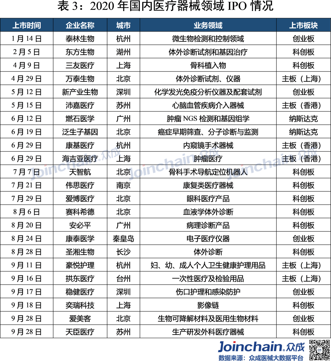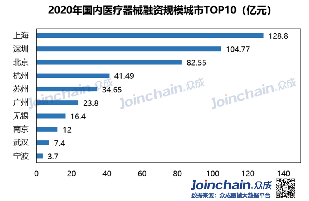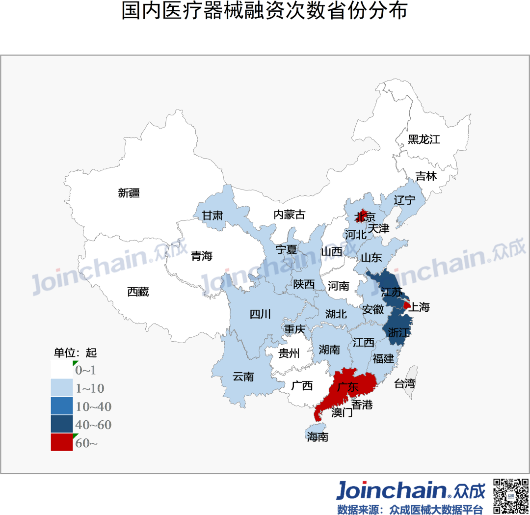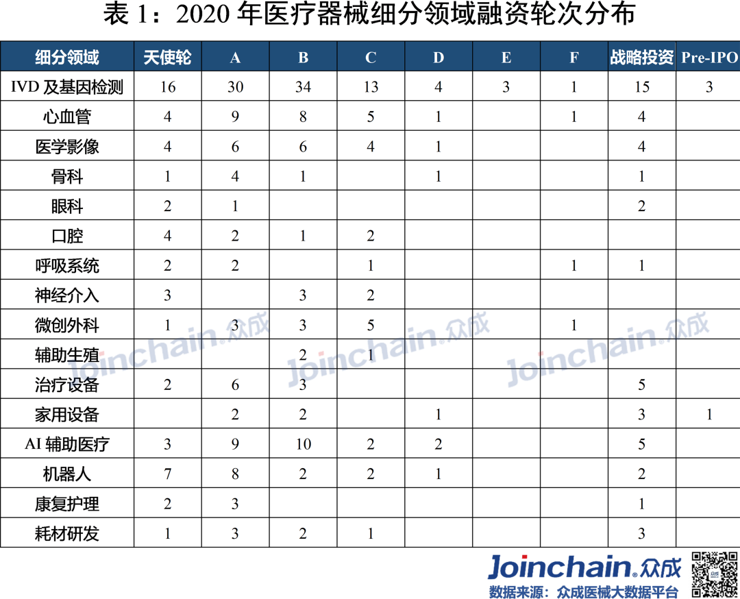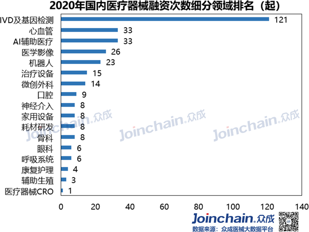 2020年疫情“黑天鹅”突袭,实体经济受到重创,资金募集脚步放缓。在防“疫”、战“疫”过程中使用的医疗器械高达上百种,包括口罩、防护服、呼吸机、监护仪、超声诊断仪、输液泵等。作为疫情下最热门的领域,医疗器械在资本市场呈现“逆流之势”。众成医械研究院基于大数据平台,完成2020年国内医疗器械融资分析,与各位读者分享。 概况: 融资事件达330起,融资规模近480亿元 据众成医械大数据库不完全统计,2020年国内医疗器械领域共发生了330起融资事件,融资规模达476.96亿元(不包括IPO、定向增发等)。 从全年来看,第一季度受疫情影响,医疗器械融资经历低潮之后回暖,并在12月份迎来融资高峰。四月份开始每月融资金额均超过20亿元,其中,5月份华大智造完成超过10亿美元B轮融资,带动当月总融资金额超97亿元,8月份微创医疗机器人完成30亿元战略投资,带动当月总融资金额接近60亿元。12月融资事件数量达到全年峰值(59件),鹍远基因和迈迪顶峰等十亿级融资事件,推动当月融资金额突破100亿元。 细分:IVD、心血管热度不减,AI与机器人成投资新宠 从融资次数看,2020年IVD及基因检测领域融资事件达121起,占比超过36%;心血管(33起)、医学影像(26起)等国产替代重点领域仍是投资热点;在医疗智能化趋势与应用场景逐步拓宽的背景下,AI辅助医疗与医疗机器人等领域获资本追捧,融资事件分别达33起、23起;此外,辅助生殖、医疗器械CRO等新瞩目赛道逐渐出现。 从融资规模看,IVD及基因检测领域融资额超245亿元,占比超51%;心血管领域融资额超65亿元,占比超13%;医疗机器人超40亿元;AI辅助医疗和医学影像等领域融资额均超过20亿元。 轮次:A、B轮次相对密集,战略投资多属IVD领域 在2020年国内医疗器械领域330起融资事件中(不含IPO、定增等),融资事件多集中在A轮与B轮阶段,数量分别为87、82起,合计占比超52%;此外,天使融资、战略融资和C轮融资事件均在35起以上。 IVD及基因检测、心血管、医学影像和AI辅助医疗等热门领域,融资项目多处于A、B轮阶段;处于战略投资阶段的企业超过三分之一为IVD及基因检测领域。 区域:北上广融资最为活跃,上海深圳均突破百亿元 2020年国内医疗器械领域融资项目主要分布在沿海发达地区,且长三角相对密集。 从融资数量看,在省份层面,广东省以76起的融资事件位居第一;北京和上海均超过60起,分别为67起和64起;江苏和浙江分别为48和40起;大部分省份融资事件居0~2起之间。在城市层面,深圳市以53起的融资数量紧追北京市和上海市,杭州和苏州则分列第四(31起)和第五(27起)。 从融资规模看,在省份层面,广东省以132.77亿元的融资规模居于全国首位;上海市(128.8亿元)、北京市(82.55亿元)、江苏省(67.4亿元)和浙江省(46.64亿元)占据前五,其余省份融资规模均在8亿元以下。 在城市层面,上海市和深圳市的融资规模均突破百亿元,杭州市、苏州市、广州市、无锡市、南京市、武汉市和宁波市进入前十。 从细分领域看,在IVD及基因检测领域,广东省融资项目最为密集,北京市和浙江省均超过20起;在AI辅助医疗领域,北京市融资事件最多(14起);医疗机器人领域,广东省融资事件最多(7起)。 典型:华大智造刷新行业纪录,23家器械领域企业IPO 华大智造:获得国内基因领域最大融资额。5月28日,深圳华大智造科技有限公司宣布完成B轮融资,领投方为IDG资本和CPE,融资额超过10亿美元,这是继2019年5月首轮募资后,华大智造完成的第二轮大规模融资,同时也创下近年国内基因领域最大私募融资金额纪录。公司为华大集团旗下子公司,成立于2016年,是全球三家能自主研发并量产临床高通量基因测序仪的企业之一。 微创医疗机器人:获得国内医疗机器人领域最大融资额。8月31日,上海微创医疗机器人(集团)股份有限公司完成30亿元战略投资,包括15亿元的直接增资以及15亿元的股权转让。投资方是高瓴资本、远翼投资、易方达基金等。公司成立于2015年,专注于手术机器人的研发与产业化突破,业务覆盖腔镜、骨科、血管介入、自然腔道、经皮穿刺五大“黄金赛道”。2020年12月31日,公司与中金签署上市辅导协议,拟于科创板上市。 鹍远基因:获得国内癌症早筛领域最高融资额。12月15日,上海鹍远生物技术有限公司完成近10亿元B轮融资,由中金资本旗下的中金启德创新生物医药基金领投,德同资本、复容投资共同领投。公司成立于2014年,致力于开发基于高通量测序和甲基化技术的肿瘤早期筛查和诊断产品。公司正在积极为其核心产品常乐思准备FDA申报。 迈迪顶峰:获得2020年心血管器械领域最大融资额。12月31日,北京迈迪顶峰医疗科技有限公司完成超过10亿元C轮融资。由清松资本和兰馨亚洲共同领投。公司成立于2005年,围绕着心血管疾病开发医疗设备及高端耗材。完成本轮融资后,公司将集中精力加强产品的市场开发力度,着力深化科研创新,强化公司在心脏外科产品、介入产品和生物制品的市场和技术领先地位。 2020年IPO数量同比增长64%,第三季度IPO最为密集。2020年医疗器械领域IPO企业数量达23家,相比于2019年的14家同比增长64%。从月份看,9月份独占6家,6、8月均有4家;从细分领域看,IVD及基因检测领域最多,共有10家;从上市板块看,科创板占10家,创业板占5家。 小结 2020年中央经济工作会议将“增强产业链供应链自主可控能力”列为“2021年八项重点任务”之一,高端医疗装备实