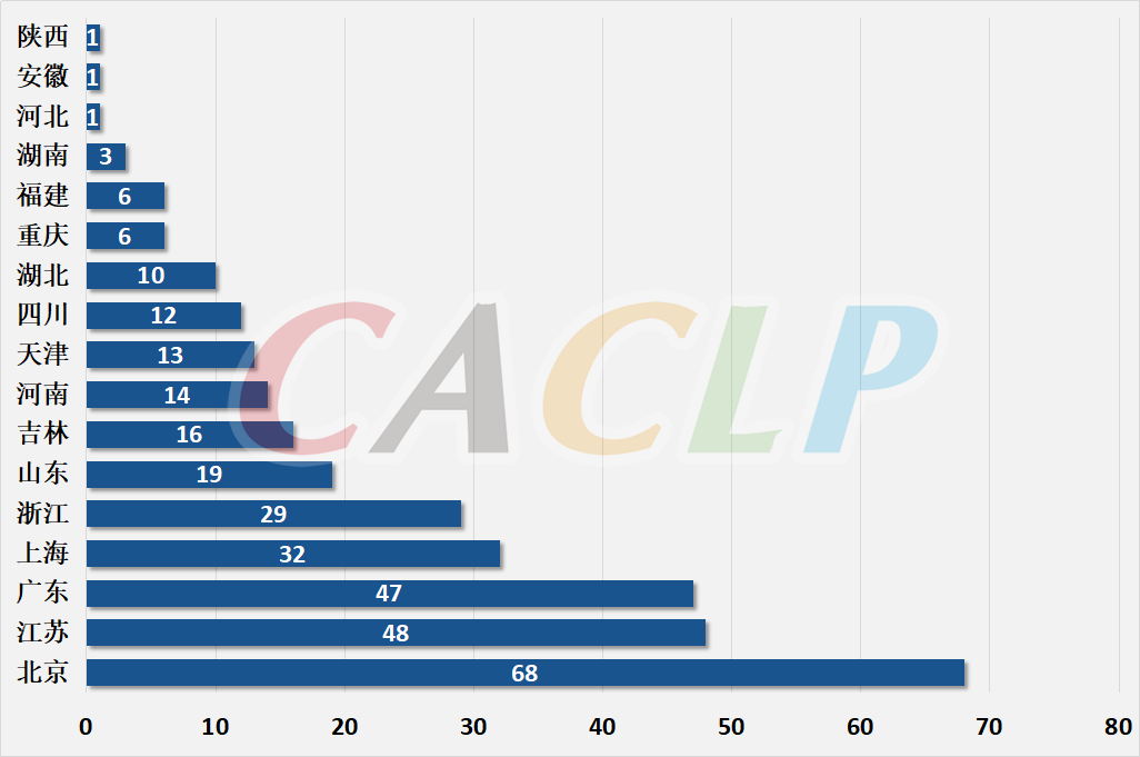 注册产品数量前三的省市分别为:北京、江苏、广东。获证产品分布数量见下图: