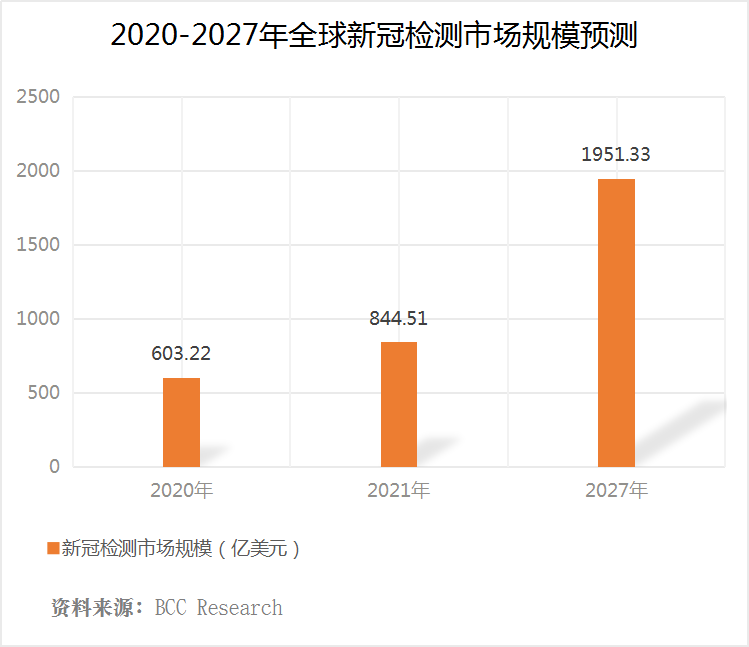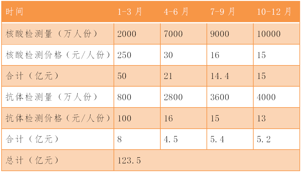 新冠疫情现状 据路透社伦敦2月18日报道,数据显示 在世界各地报告的每日新增新冠病毒感染病例数已经下降一个月,并在周二降至自10月中旬以来的最低点。但是,春节前国内多地报告本土散发病例和聚集性疫情,疫情呈现持续时间长、涉及范围广、传播速度快、患者年龄大、农村比例高等特征,有的地方出现了社区传播、多代传播,防控形势依然复杂严峻。 新冠病毒检测方法 新型冠状病毒的检测方法主要包含核酸检测、抗体检测、抗原检测几种方法。 ◇ 抗原检测可直接检测出样本中是否含有新型冠状病毒,诊断快速、准确、对设备和人员要求低,但检出率也相对较低。 ◇ 目前新冠检测主要集中在抗体和核酸检测,核酸检测可以直接检测出体内是否有病毒,是目前检测的金标准。具有早期诊断、灵敏度和特异性高等特点。 ◇ 抗体检测需要进行血液采集,操作便捷、检测迅速,但由于抗体的产生具有滞后性,因此不适合早期冠状病毒检测,可作为核酸诊断的补充手段。 国内新冠检测产品情况 截至2021年2月10日,国家药品监督管理局经审批批准56个新冠病毒检测试剂,其中包括26个核酸检测试剂,27个抗体检测试剂,3个抗原检测试剂;核酸检测试剂日产能665.6万人份,抗体检测试剂日产能1646万人份,抗原检测试剂日产能190.3万人份,累计日产能2501.9万人份。 新冠检测市场规模 根据 BCC Research 最新调研报告预计 2020年全球新冠检测市场高达 603亿美元,且到2027年将增至1951亿美元,CAGR为15%。 从新冠检测产品相关企业披露的2020年业绩预告来看,2020年度业绩增速瞩目,尤其是产品早期上市的企业获利颇丰,其中圣湘生物同比增长6375%到7008%,堪称业绩“增速王”。 圣湘生物: 2020年度净利润同比预增25.2亿到27.7亿元,增幅 6375%到7008%; 之江生物: n 2020年年度归母净利润93,002.14 万元左右,同比增加 1,705.10%左右; 东方生物: 2020年年度实现归母净利润155,597.21 万元,同比增加 1795.10%左右; 华大基因: 2020年净利润200,000 万元–230,000 万元,同比增加623.77%-732.34%; 热景生物: 2020年年度实现归母净利润 10,732 万元左右,同比增加 216%左右; 凯普生物: 2020年年度归母净利润32,000万元-39,300万元,比上年同期增长127.94%-181.88% 迪安诊断: 2020年年度归母净利润34,728.18 万元,比上年同期增长139% - 182%。 国家卫健委6月公布的数据显示 国内上半年核酸检测累计约为9000万人份。下半年根据疫情防控工作部署,要求扩大“应检尽检”核酸检测范围、增加定期检测频次,我们推测检测量有所增长。 根据西南证券研报显示 截止9月底,金域医学新冠检测量累计超过2200万人份,预计全年新冠核酸检测量将超过3200万人份。约占全国核酸检测总量近十分之一。因此我们推测2020全年核酸检测量约为25000-30000万人份,抗体检测量约为核酸检测量的30%-50%,约为7500-15000万人份,根据不同时期公布的中标价,我们取均值计算如下: 来源:公开资料,小桔灯网整理 根据不同时期的中标价及检测量,推送出国内新冠检测试剂的市场规模约为123.5亿元(第三方医学实验室销售价格一般高于集采中标价,此处不再进行区分)。 早前,浙商证券研究所根据2020年年中的统计测算,全国按等级分有三级医院2831家,二级医院9901家,专科医院1102个,疾控机构3402个,假设在《进一步推进新冠病毒核酸检测能力建设工作方案》等相关政策推出前三级医院全部已具备核酸检测能力,专科医院、疾控机构60%已具备核酸检测能力,二级医院 10%已具备核酸检测能力,则合计10700家医疗机构需要在2020年完成核酸检测能力建设。按照单个实验室134万元的保守造价测算,则将带来143亿的增量市场空间。由此最终推算出国内新冠检测市场规模约为266.5亿元。 参考文献: 1.国务院联防联控机制新闻发布会报告 2. 西南证券 金域医学新冠检测需求持续旺盛,常规业务恢复增长 3. 中信证券 迪安诊断业绩略超预期,新冠检测持续贡献业绩 4. 浙商证券 后疫情时代,PCR行业迎投资布局新机遇期 |