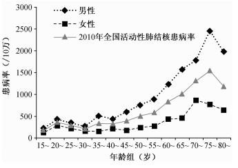 2019年结核病>10万的国家和地区 Global tuberculosis report 2020. Geneva: World Health Organization; 2020. Licence: CC BY-NC-SA 3.0 IGO. 在我国,每年新发结核病患者数量多达90万,新发耐多药结核病患者7万(2018年数据)。我国是全球30个结核病高负担国家之一。 根据《2010年全国第五次结核病流行病学抽样调查报告》显示,我国结核疫情现状可以用四个“高”进行总结:感染率高(44.5%)、患病率高(367/10万)、耐药率高(18.6/10万)且死亡率高(9.8/10万)。 2010年全国不同性别-年龄组活动性肺结核患病率 2010年全国第五次结核病流行病学抽样调查报告.中国防痨杂志, 2012, 34(8): 485-508. 近年来,校园群发肺结核事件时有发生,诸如2017年11月湖南桃江四中肺结核暴发事件,在2015级364班中有20多个学生被确诊为肺结核;2020年10月份江苏师范大学文学院有十几名学生感染肺结核。 结核的传染源:通常为正在排菌的涂阳肺结核患者。此类患者在咳嗽、咳痰时会排出大量的结核杆菌,且痰中的结核杆菌越多,其传染的危险性越大。 传播途径:通常通过呼吸道传染,以飞沫传染为最主要的方式。咳嗽、打喷嚏是肺结核患者产生飞沫的主要方式,健康人可以因吸入患者喷出的带有结核杆菌的飞沫而受到感染。其次是经消化道进入人体,如饮用未经消毒带有大量结核杆菌的牛奶可能引起肠道感染。 otsuka 世界上约有三分之一(约20亿)的人口感染结核杆菌,但其中只有很小一部分人会患上结核病。因为,约有90%的结核杆菌感染者为无症状患者(潜伏感染,LTBI),并有10%的感染者会发展为开放性结核病。而感染后是否发病与人体免疫力、结核杆菌数量以及毒力等因素都密切相关。 肺结核的易感人群 一般来说,所有人都是肺结核的易感人群。免疫力低下的人感染结核菌后更容易发病,如幼儿、老年人、HIV(艾滋病毒)感染者。艾滋病病毒感染者特别容易感染结核病,而且合并感染很常见