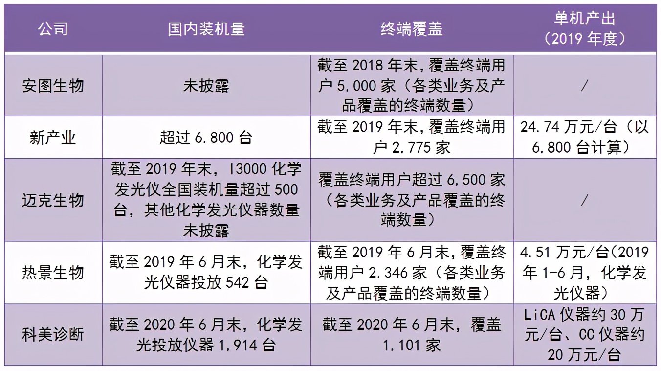 主营业务 科美诊断技术股份有限公司成立于2007年,主要从事临床免疫化学发光诊断检测试剂和仪器的研发、生产和销售。主要产品为基于光激化学发光法的LiCA系列诊断试剂和基于酶促化学发光法的CC系列诊断试剂及仪器。招股说明书显示,科美诊断是国内首个基于“活性氧途径均相化学发光”研究开发化学发光技术并实现产业化的企业。截至2020年7月31日,共拥有178项国内医疗器械注册证书,其中LiCA系列试剂产品注册证49项,CC系列试剂产品注册证58项,其他(主要为生化试剂)产品注册证71项。科美诊断化学发光检测试剂涉及传染病、肿瘤标志物、甲状腺激素、生殖内分泌激素、心肌标志物及炎症等领域,基本覆盖了国内化学发光检测临床使用量较大的主要检测项目。 营业收入与净利润 2017年至2019年,科美诊断营业收入分别为31,860.30万元、36,605.85万元、45,466.65万元,复合增长率19.46%,高于行业平均水平。LiCA系列产品和CC系列产品为公司主要收入来源,占公司销售收入的比重合计超过99%。2017年和2018年净利润大额亏损,分别达到43,522.96万元和42,424.50万元,原因是为充分调动管理层和员工积极性,利于吸引优秀人才、提高凝聚力,科美诊断于2017年度及2018年度分别确认股份支付费用 5.24 亿元和5.20 亿元。 产品结构单一,主要集中于传染病领域。 科美诊断产品注册证主要集中于传染病领域,传染病领域销售收入占比约 90%,传染病外的其他领域(主要包括肿瘤标志物、甲状腺激素、生殖内分泌激素、心肌标志物和炎症等)占比较低。 研发投入逐年递增,研发投入 增长率不及同行业上市企业 截至2020年6月30日,科美诊断拥有研发人员122名,占比21.03%。2017-2019 年研发投入分别为3223.52万元、5091.84万元和5644.90万元,研发投入占比整体营业收入的比例由2017年的10.12%增长至2020年1-6月的14.99%。研发投入逐年递增,研发投入占营业收入的比重总体不断增长。但是,新产业、安图生物、热景生物、迈克生物和迈瑞医疗等IVD企业2019年的研发费用增长率分别达到了42%、47%、58%、29%和16%,而科美诊断仅增长了11%,不及同行业上市公司。 仪器设备采购供应商较为集中 截至2020 年7 月31 日,科美诊断LiCA 系列产品配套的检测仪器LiCA 500 型及LiCA 800 型均由嘉兴凯实独家供应。仪器设备采购相对集中,可能对科美诊断的生产经营产生不利影响。 装机数量和终端覆盖用户数量较少 截至2020年6月末,公司化学发光投放仪器1914台,覆盖1101家终端用户,相较于其他主要竞争对手的国内装机数量和客户覆盖程度仍有一定差距。 注:不同厂商经销与直销占比存在差异,单机产出数值非完全可比。科美诊断单机产出以截至2019年末投放仪器数量和2019年度销售收入计算。 从酶促化学发光到光激化学发光的战略转变 化学发光包含免疫反应(抗原抗体特异性结合)和发光反应两个反应部分,发光反应是化学发光物质经催化剂的催化或氧化剂的氧化等反应过程释放光子,出现发光现象的过程。根据标记物和发光原理的不同,化学发光免疫分析主要可以分为:酶促化学发光、直接化学发光、电化学发光、活性氧途径均相化学发光等。光激化学发光法属于“活性氧途径均相化学发光”。 2016年及以前,科美诊断主要基于酶促化学发光技术平台,2015年10月,公司控股股东CDMC完成对博阳生物境外母公司博阳开曼的收购。2017年1月,公司完成对博阳生物的收购。收购博阳生物后,确立了重点发展LiCA系列产品的发展战略,减少并逐步停止了对CC系列产品的新产品研发和原有产品升级。LiCA系列产品收入从2017年的1.39亿元增长至2019年的2.99亿元,年均复合增长率超过45%。公司 博阳生物: 成立于2005年,主要从事光激化学发光相关产品的研发、生产和销售。2014年8月,CDMC(科美诊断前身-科美生物的原股东)收购Meditech、HDC间接持有的博阳开曼63.84%的股权,2015年10月,CDMC收购ZHAO WEIGUO、WANG CHENGRONG、HE YUAN直接持有的博阳开曼36.16%的股权。上述收购完成后,CDMC持有博阳开曼100%的权益。2017年初,博阳生物由博阳香港100%持股,博阳香港系博阳开曼的全资子公司。2017年1月,博阳香港将博阳生物100%股权转让给科美生物,博阳生物成为科美生物全资子公司。 国内化学发光市场竞争激烈,进口产品占据国内化学发光约80%的市场份额,其中雅培、罗氏、贝克曼及西门子为代表的国际IVD巨头占据了约70%的市场份额。据测算,我国化学发光市场规模在2023 年将达到384 亿元,2029 年将增长至842 亿元。科美诊断的化学发光检测项目收入在2019 年占我国化学发光市场规模的2.15%左右。 化学发光常见应用领域有传染病、肿瘤标志物、生殖内分泌激素、心脏标志物、甲状腺等项目的检测,其中传染病和肿瘤标志物检测市场规模较大,分别占据了约40%、25%的比例。传染病检测规模最大,而肿瘤标志物检测则增速更快。罗氏、雅培、西门子等IVD巨头早年采用酶促化学发光法,此后逐渐选择直接化学发光或电化学发光等化学发光方案。 化学发光行业主流技术路线对比 写在最后 整体来看,科美诊断是行业内少数掌握并应用光激化学发光法的企业,基本覆盖了国内化学发光检测临床使用量较大的主要检测项目,随着在研的LiCA 系列产品陆续获批,公司产品的市场占有率有望进一步提升。另一方面,公司员工激励导至巨额亏损,净利润中税收优惠占比过高,未来业绩持续性难以保证。同