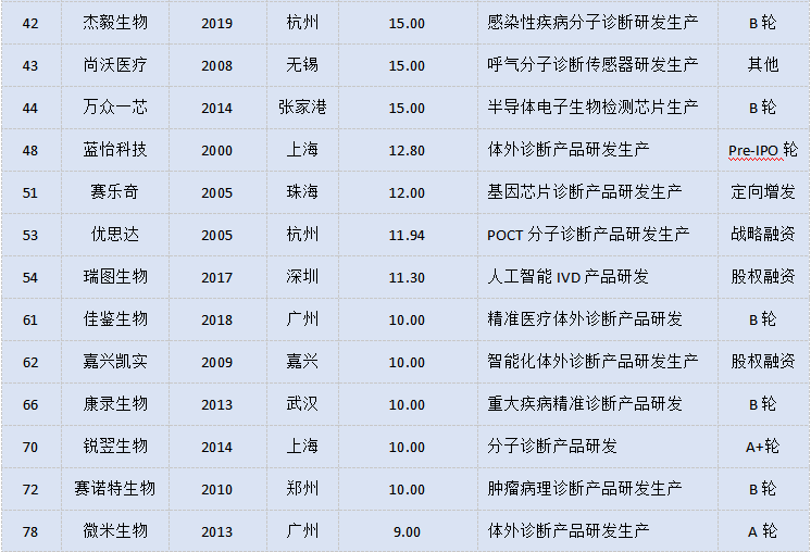 2021年4月16日,由动脉网主办,苏州市吴江区人民政府、广东省钟南山医学基金会联合主办,第五届未来医疗100强大会颁奖晚宴上,动脉网对外发布了《2020-2021未来医疗100强系列榜单》。其中共有31家IVD公司上榜! 未来医疗100强 未来医疗100强主榜是由动脉网、蛋壳研究院推出的国内第一个针对非上市企业的创新医疗领域榜单,旨在遴选真正代表未来医疗的中国创新医疗企业,发现我国未来医疗产业的核心力量。 2020年未来医疗100强主榜包含中国医疗服务榜、中国数字医疗榜、中国创新器械榜、中国创新医药榜、中国医疗商业服务榜、海外创新企业榜六张榜单。 参考资料:动脉网,未来医疗100强榜单,本文仅做筛选排列,如有任何侵权或转载纰漏,请联系删除。 |