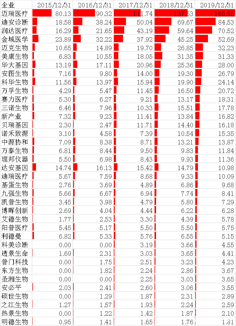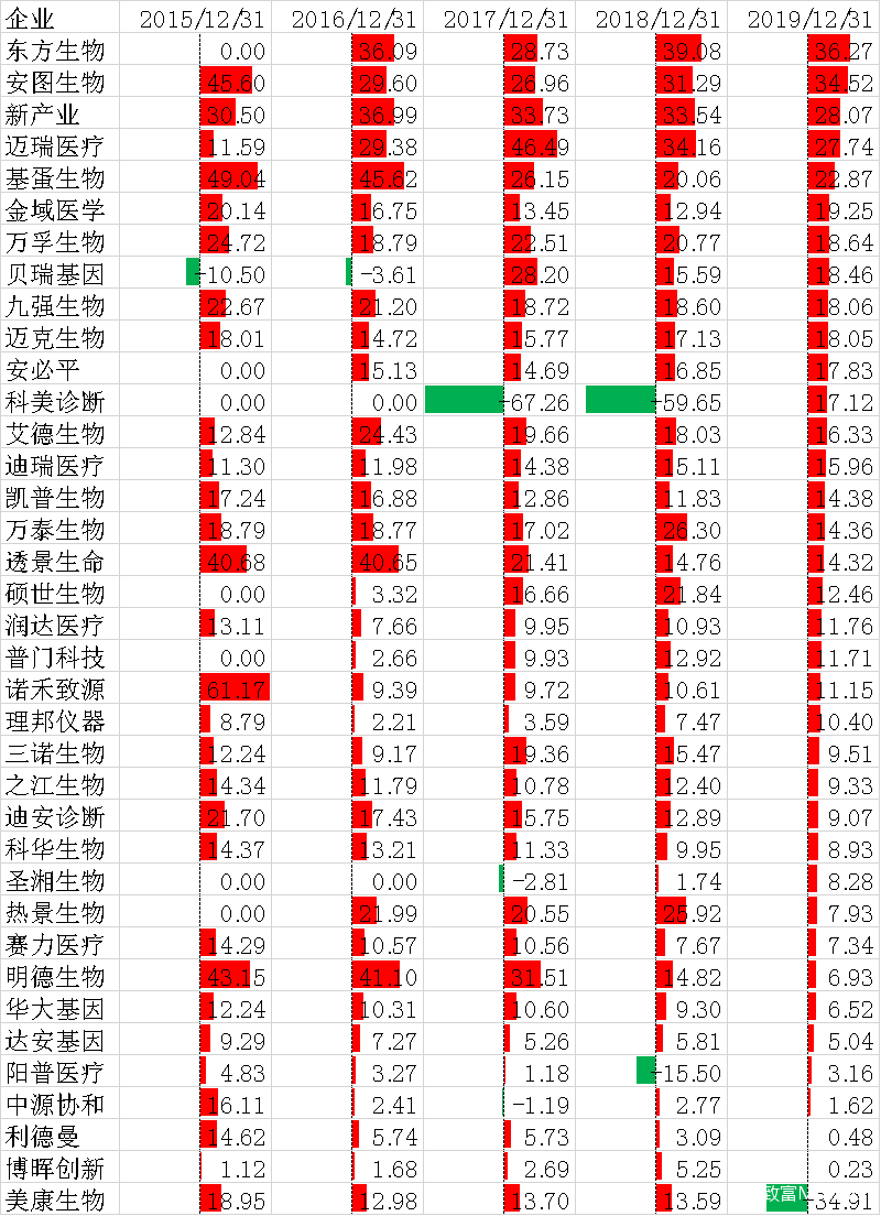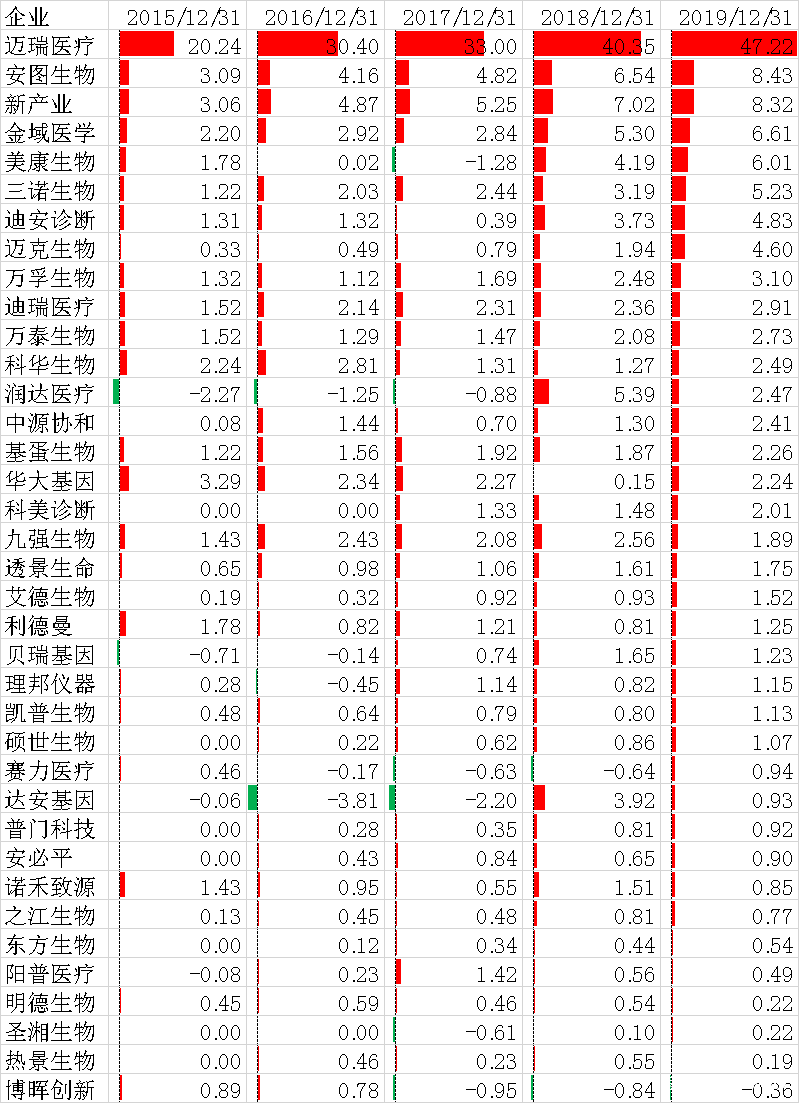 大家好,我是IVD大碗牛肉。 前两期IVD企业年报-IVD企业销售薪酬哪家强?IVD企业年报-研发经费大数据报告引起行业广泛关注。这期我们对各IVD企业近五年(2015-2019年)数据进行横向对比,让我们检阅一番,一睹风采。 老规矩,有几点先交代: 营业收入就是交了货,收了钱或者觉得可以收到钱都算。净利润,营业收入扣掉给产品成本、销售费用、管理费用、研发费用,还有些一般不重要的小项目,然后交了税。经营净现金流,销售商品和出售劳务收到的现金和付出的现金差额(跟股东和债主的往来算筹资现金流,买设备、买理财、买股权算投资现金流)。神秘的ROE我后面再解释~ 主体是试剂设备生产商,同时包括三方检验服务,如金域医学,还包括流通商,如润达医疗。迈瑞医疗是国内医疗器械老大,体外诊断占收入三分之一有余,放进去做个尺子。 表中所有的数据均来自2015-2019年企业年报,单位是亿元(数字为0,表示当年离上市还远,我们管不着)。2020年的年报还有人没出,包括老大迈瑞。他不着急我不急,等你出齐我再比。 营业收入(单位:亿元) 2019年,IVD市场规模约700亿元,上市公司37家,有17家收入低于10亿。 迪安诊断,2001年成立,业务涉及全产业链,代理销售、三方服务、自己研产销。2020年总收入106.5亿,自主产品收入仅3.76亿。 润达医疗,1999年成立,主营代理销售,2019年营收70.5亿,自主2.8亿。 金域医学,2006年成立,三方医检的绝对龙头,病理业务独步天下。2019年营业收入52.69亿元。 明德生物,2008年成立,主营POCT。2019年收入1.8亿元。 热景生物,2005年成立,独有上转发光技术,主营POCT,2019年收入2.1亿。2021年迎来高光时刻。 之江生物,2005年成立,主做病原体分子诊断,2019年收入2.59亿。2020年下回再说。 长大是一段痛并快乐的旅程。 营业收入(单位:亿元) 除了迈瑞,净利润都在10亿以下。 安图生物,1999年成立,主做化学发光,同时发展生化和微生物。 新产业,1995年成立,聚焦化学发光。厉害。 迪安诊断,2001年成立,三方检测和代理业务体量都够大。 美康生物,2003年成立,代理为主,亏钱比较难。2019年主要是因为子公司商誉减值,就是以前100块钱买的公司,现在他认为这公司只值30块。亏了个寂寞的意思。 博晖创新,2001年成立,聚焦微流控,旗下还有两个血制品公司。奈何微流控的时代还没到来。 达安基因,1988年成立,这浓眉大眼的,净利润竟然一直在1个亿徘徊。 IVD赛道相对分散,除了化学发光,大家都没吃到大肉。新冠另说。 营业收入(单位:亿元) 净利润是自己关起门来算账,可能你觉得自己赚了不少。经营净现金流是你收到多少现金,也许一手都是白条。简单举例,100块钱买原料,投入人工50,产品成本150,有人打个200块的白条拿走,你还要交税26块。净利润是200-150-26=24块,经营净现金是-150-26=-176元,就是拿出去176块现金,手里只有一个白条。 安图生物和新产业体量够大,产品抢手,打白条不太好使,现金流杠杠滴。 金域医学三方老大的地位凸显,体量大对上游强势,钱先装自己口袋。 博晖创新、热景生物、圣湘生物,新冠之前都是小门户,不给钱发货很正常,对上游也不敢太强势。 直销还是经销、账期管控对现金均有较大影响。 营业收入(单位:亿元)
