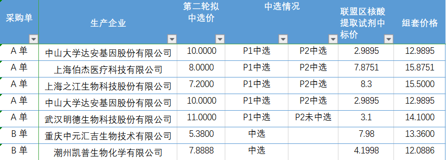 被分在第二类的IgM/IgG抗体试剂,其中A采购单最终的结果毫无悬念,安图、迈克、亚辉龙、英诺特、诺唯赞和丽珠同时中选;B采购单有博奥赛斯、金豪、和信三家中选;第三类的总抗试剂,万泰中选;第四类的抗原试剂,万孚中选;第五类都属于A采购单,因此也是没有悬念,达安、圣湘、优思达和卡尤迪中选。